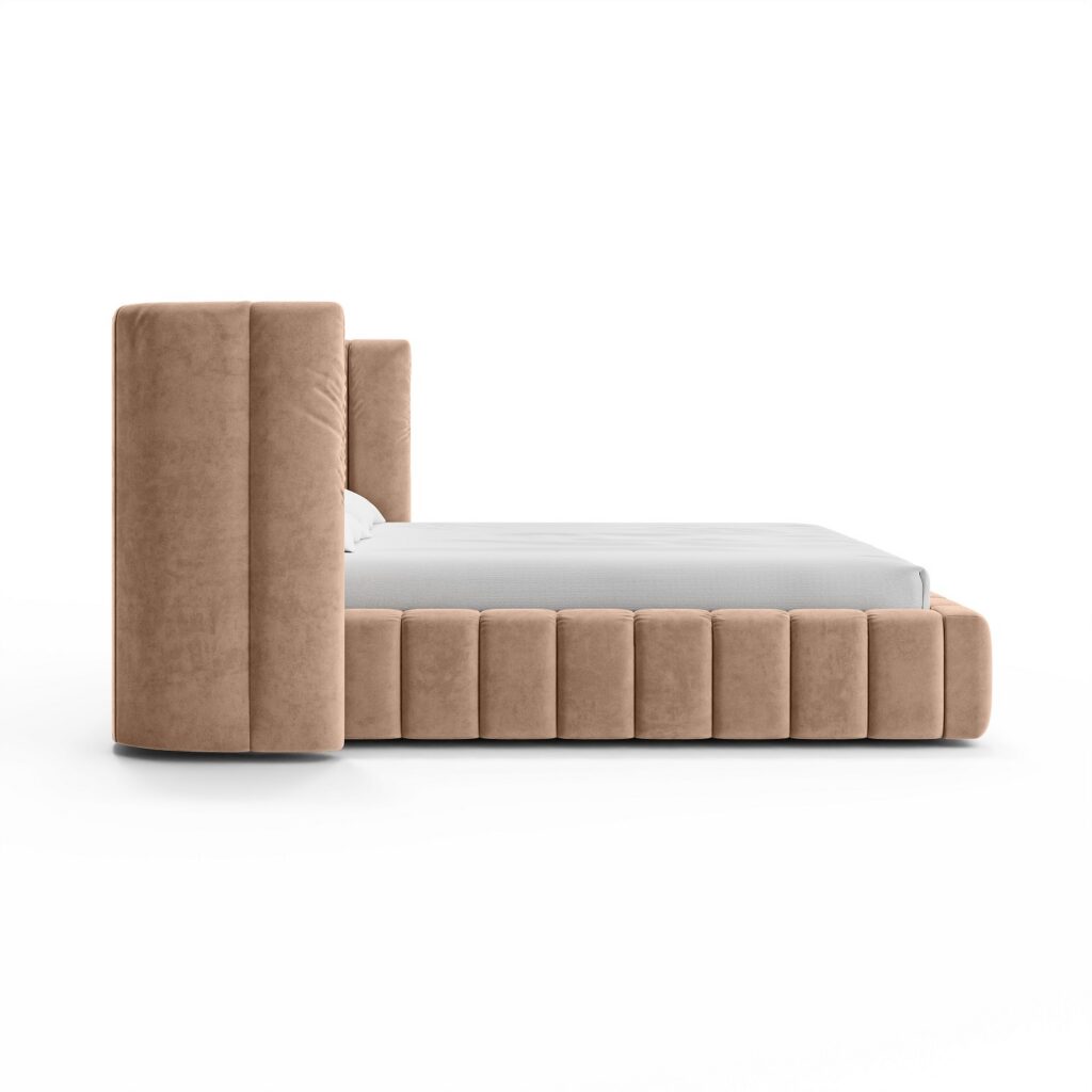 Каркас кровати полностью обит и покрыт мягкой светло-серой тканью. В дизайне преобладают округлые и однородные вертикальные секции, напоминающие подушки, что создает мягкий и привлекательный вид. Такой дизайн придает кровати роскошный и современный вид. Изголовье и изножье высокие и имеют подушкообразные разделения, что подчеркивает комфорт и визуальную мягкость. Особенно бросается в глаза приподнятый каркас кровати по бокам, который полностью охватывает основание матраса. Эта кровать прекрасно впишется в скандинавский, современный или роскошно-минималистский интерьер. Дизайн подчеркивает мягкость и комфорт, сохраняя при этом визуальный порядок и ритм.