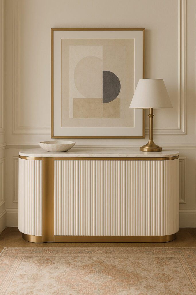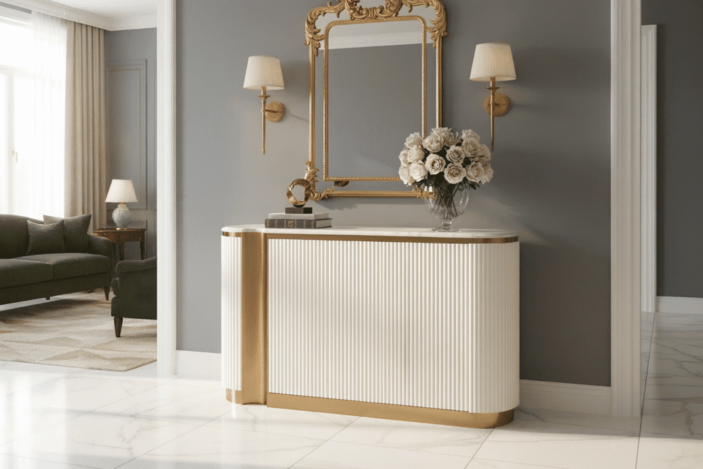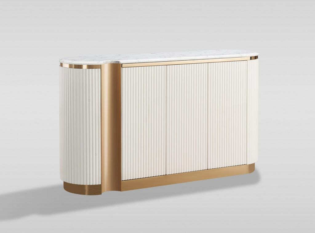 Современный стол с золотыми ножками из нержавеющей стали и столешницей, имитирующей белый мрамор из спеченного камня. Симметричные ажурные ножки с Y-образным основанием идеально сочетаются с прямоугольным верхом с закругленными краями.