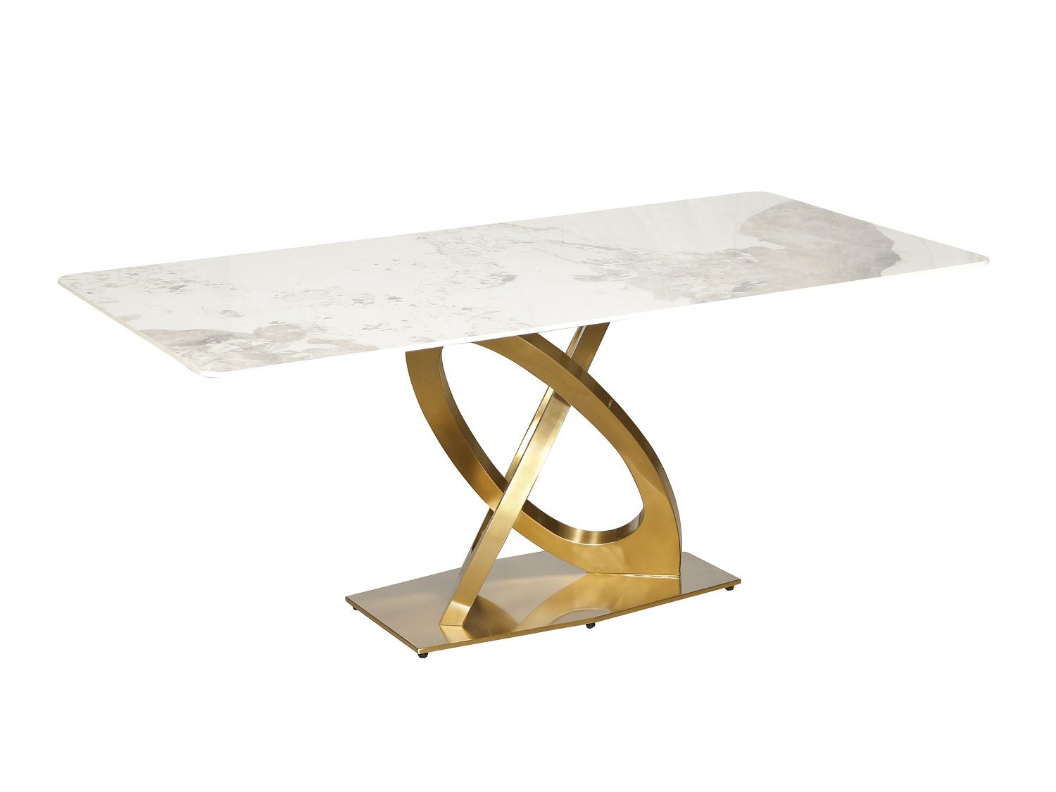 Современный стол с золотистыми ножками, выполненный в виде симметричного геометрического пространственного блока из нержавеющей стали. Белая столешница имитирует мрамор, добавляя элегантный и роскошный акцент в интерьер. Столешница изготовлена из спеченного камня и покрыта отделкой, напоминающей искусственный мрамор. Глянцевая поверхность красиво отражает свет, а матовые текстурированные детали придают дизайну глубину и характер.