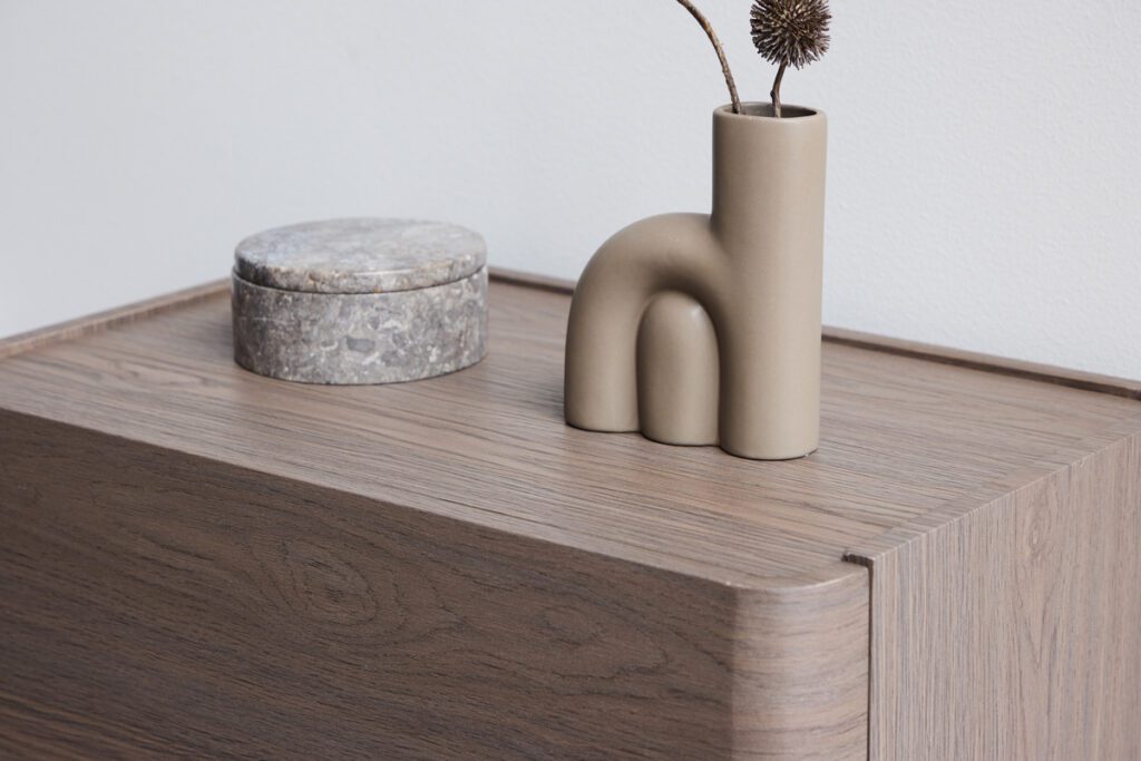 Коллекция Sileno отличается мебелью, которая очаровывает своей простотой и уникальными деталями: закругленные передние кромки, формы, подчеркнутые черными структурными элементами, и мягко закругленные боковые стороны. Черное металлическое основание продолжает линию корпуса и создает прекрасный контраст с натуральным ореховым шпоном и акцентами кашемирового оттенка. Симметричное расположение передних панелей придает всей коллекции легкость и характер.