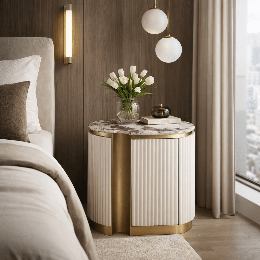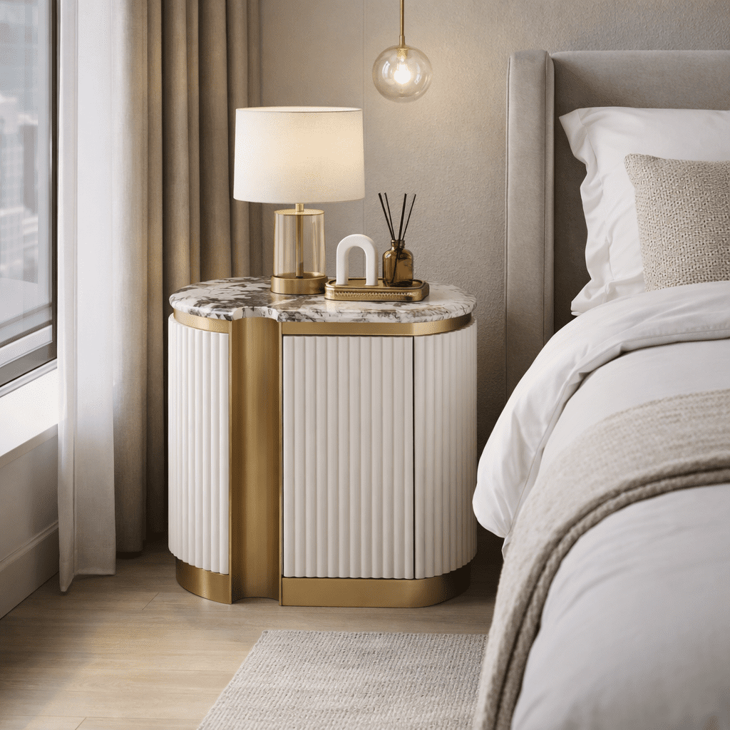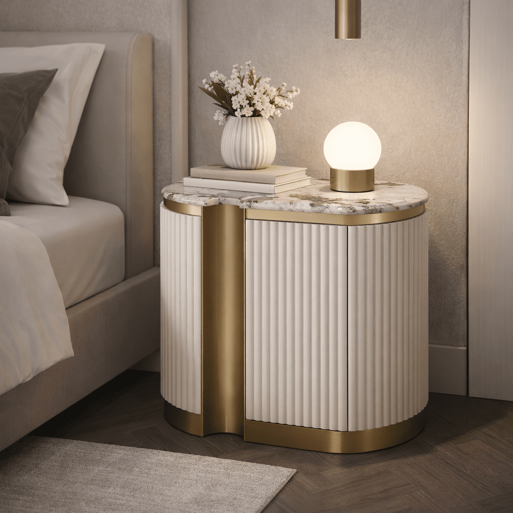 Стильная и элегантная прикроватная тумба доступна как в правостороннем, так и в левостороннем исполнении, идеально вписываясь в планировку комнаты. Тумба выполнена в современном бело-кремовом оттенке с золотыми акцентами и основанием, создающими роскошное и вневременное общее впечатление. Каркас отделан эффектной рифленой деревянной конструкцией, а столешница покрыта блестящей искусственной мраморной поверхностью с имитацией мрамора.
