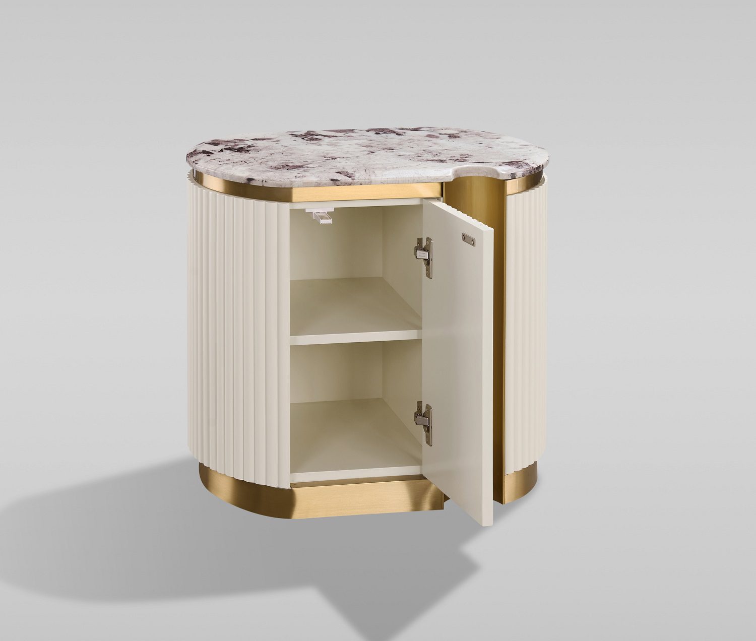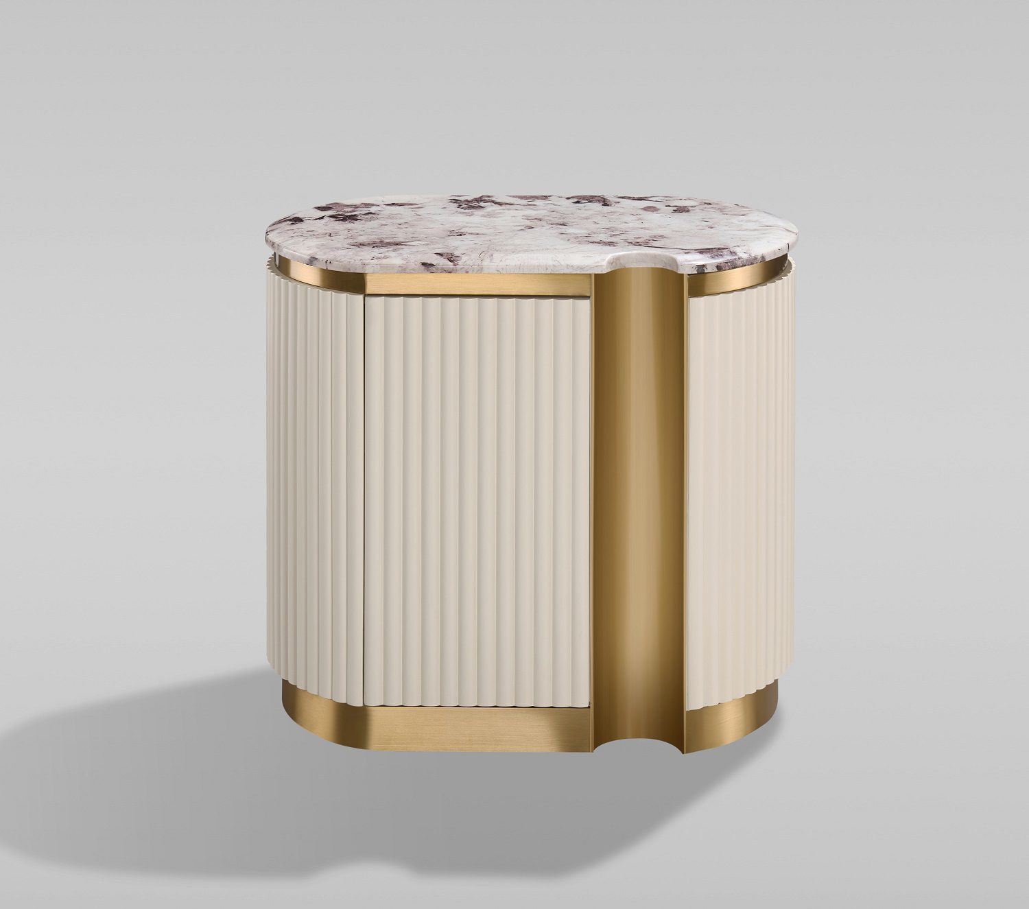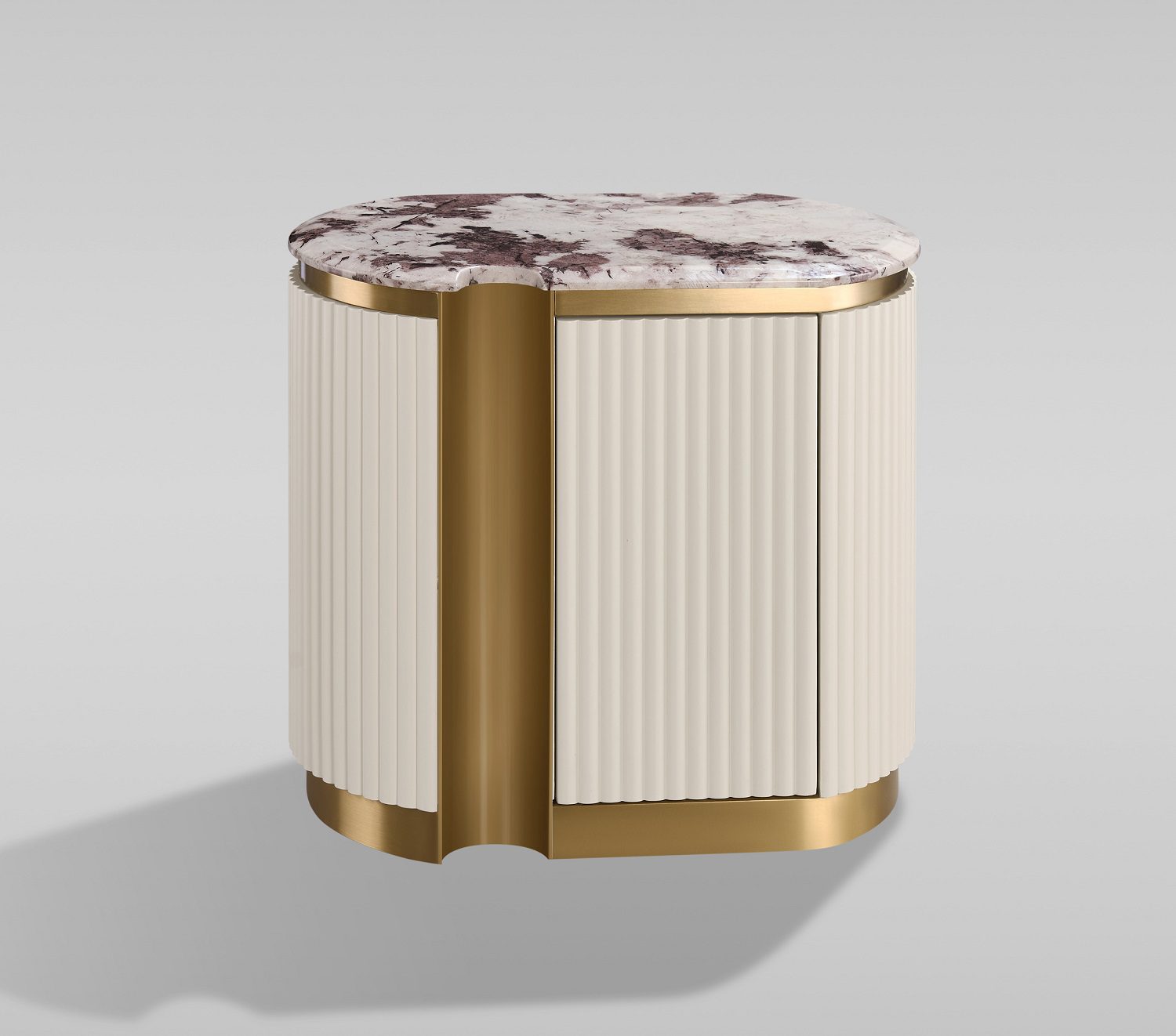 Стильная и элегантная прикроватная тумба доступна как в правостороннем, так и в левостороннем исполнении, идеально вписываясь в планировку комнаты. Тумба выполнена в современном бело-кремовом оттенке с золотыми акцентами и основанием, создающими роскошное и вневременное общее впечатление. Каркас отделан эффектной рифленой деревянной конструкцией, а столешница покрыта блестящей искусственной мраморной поверхностью с имитацией мрамора.
