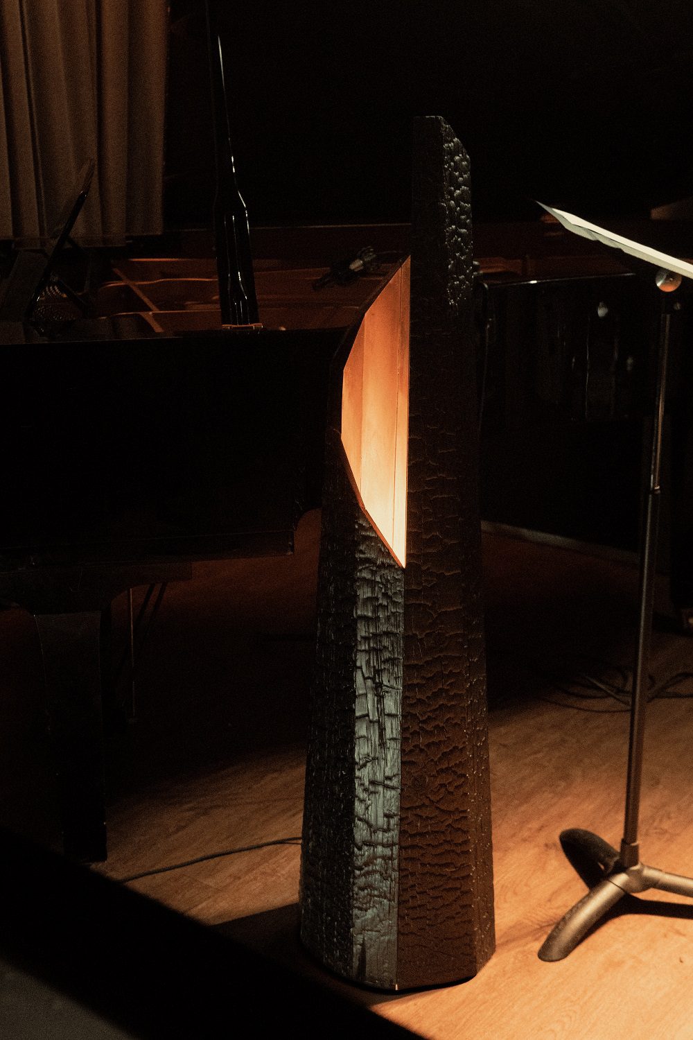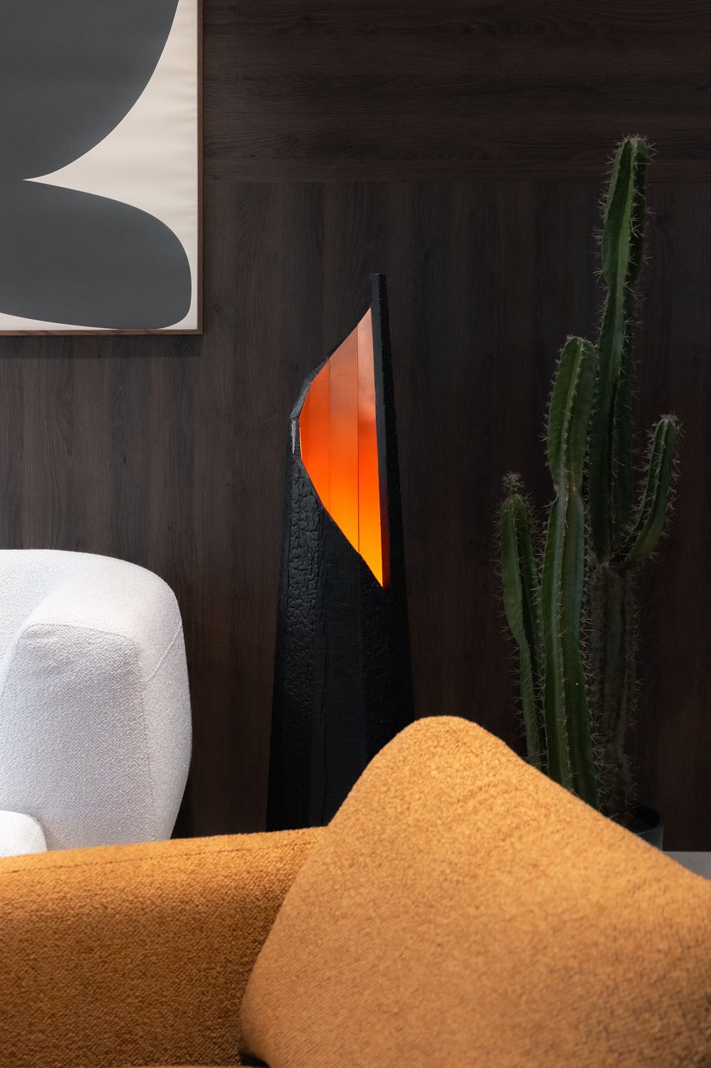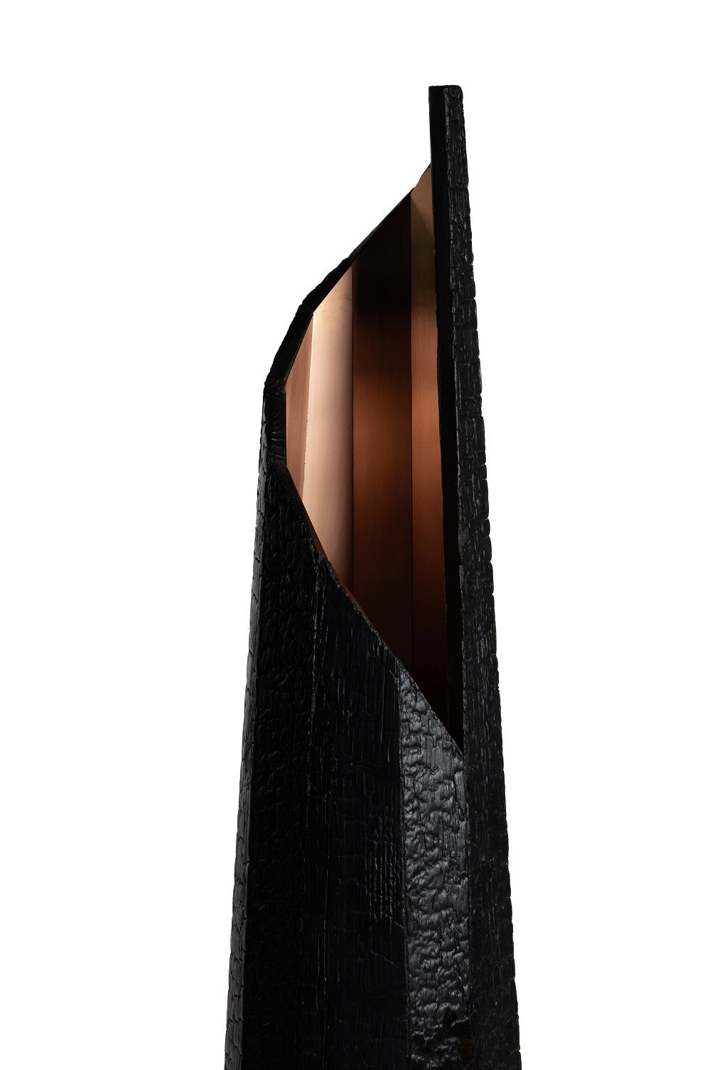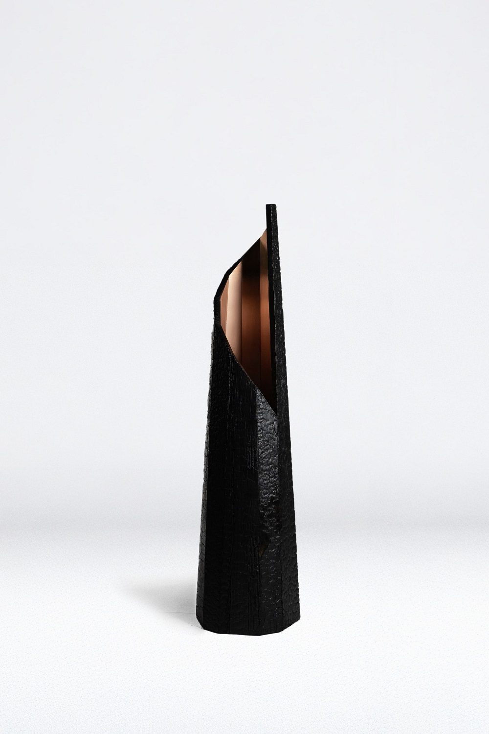Напольный светильник Yaki, выполненный в японском стиле из обожжённого дерева и меди, создаёт тёплую, живую атмосферу с огнём. Сочетание скульптурной формы и уютного света подойдёт как для тихих вечеров, так и для более оживлённых встреч.