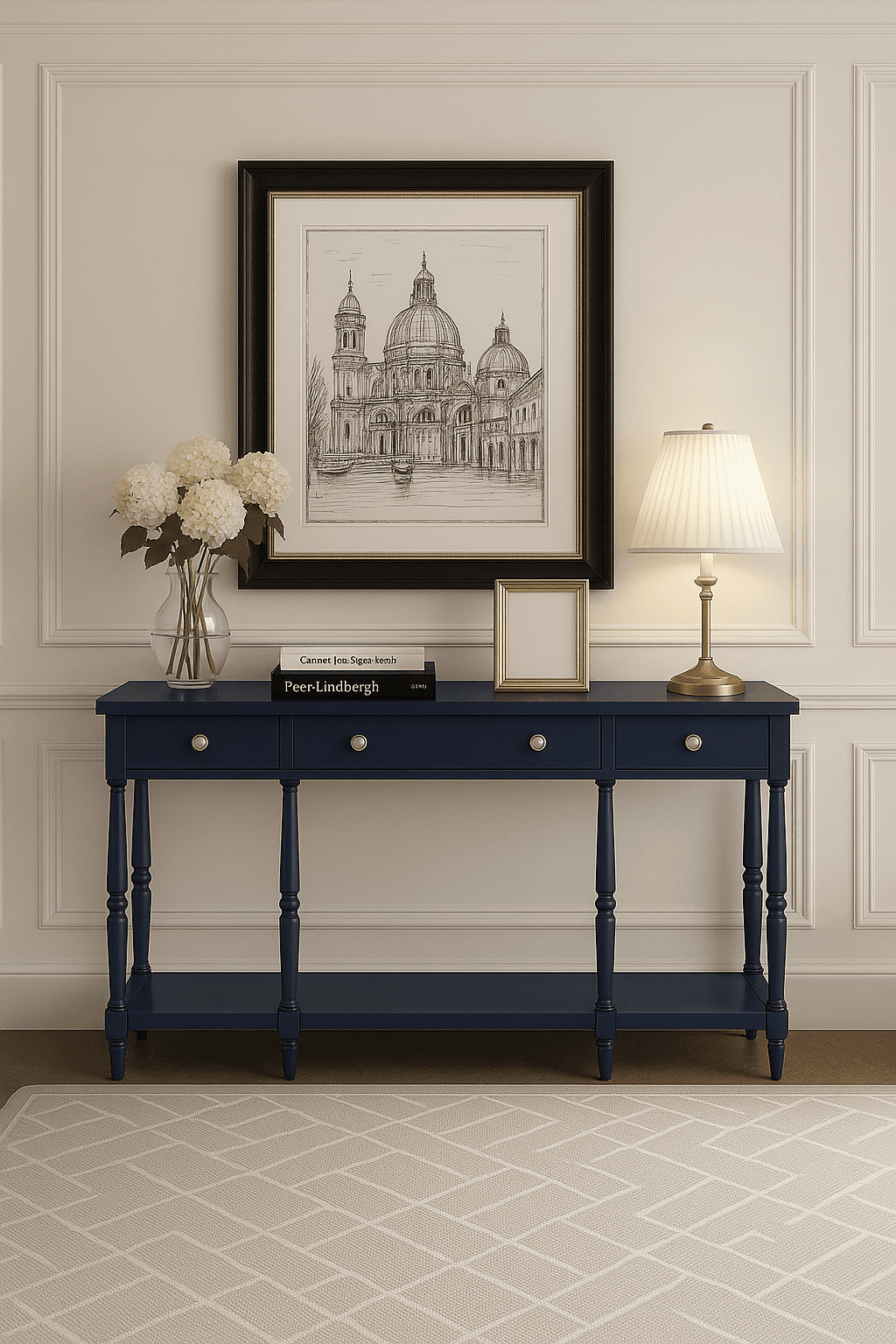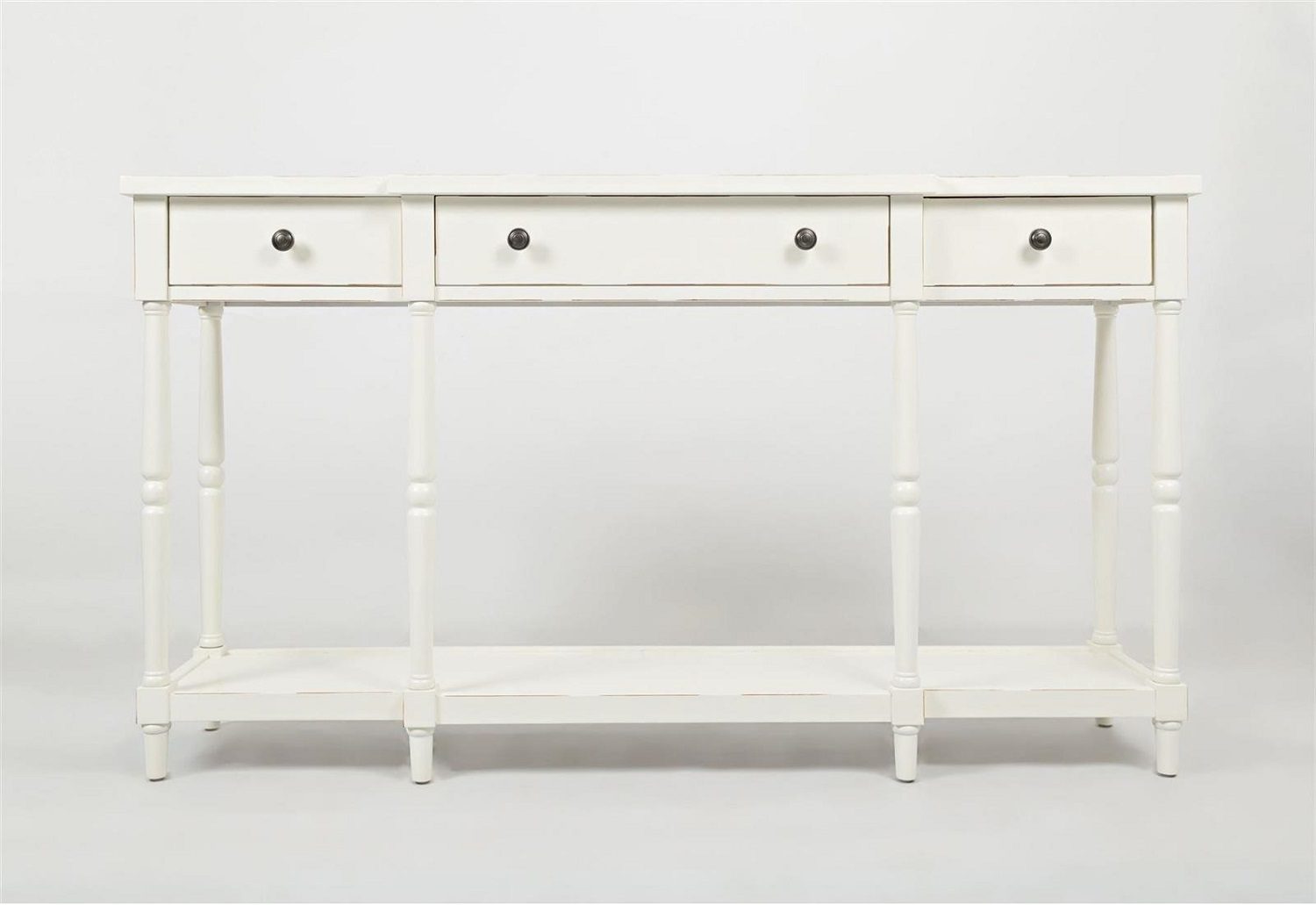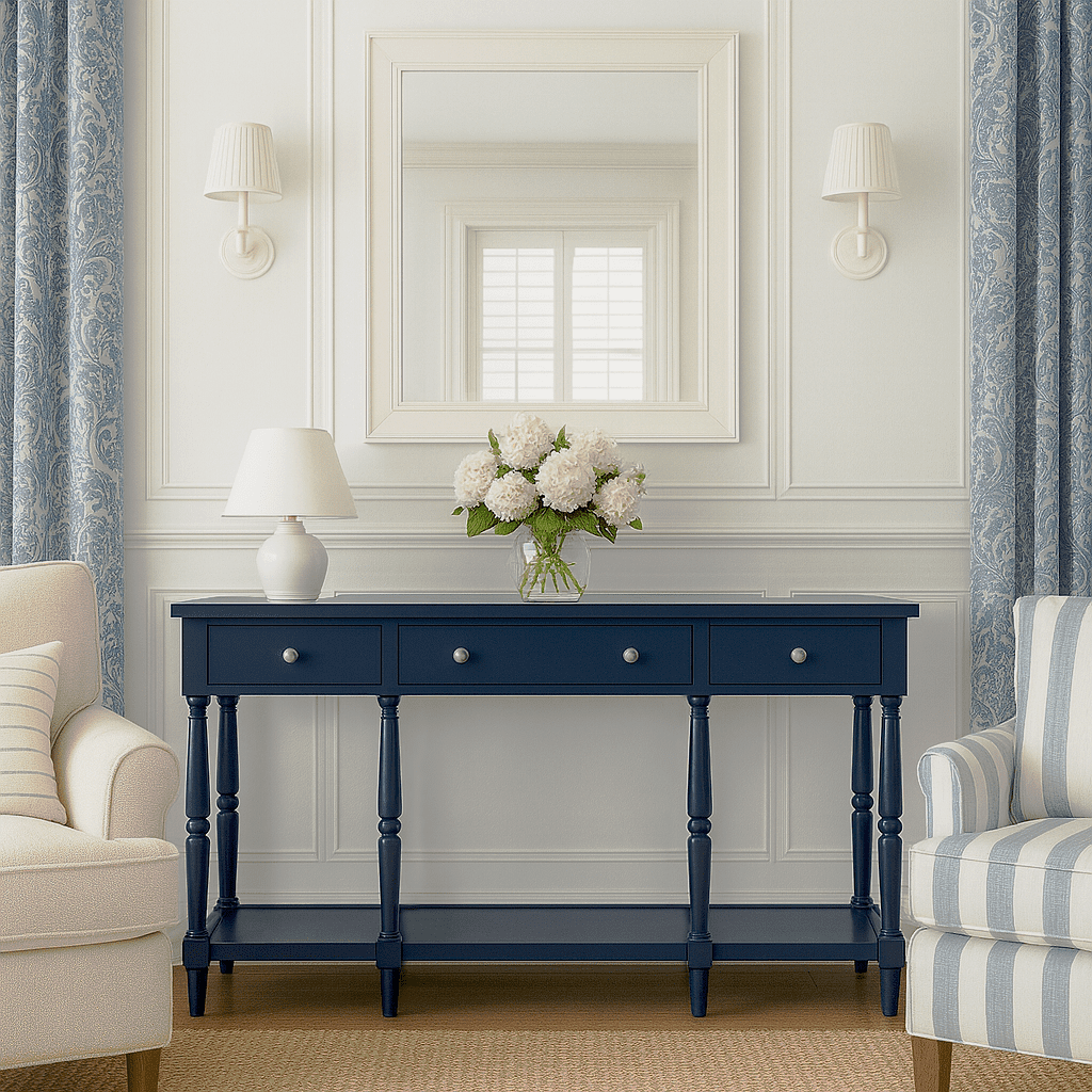 Elegantne Hampton-stiilis konsoollaud, mida iseloomustavad klassikalised treitud jalad ja ajatu disain. Laud sobib hästi nii esikusse, elutuppa kui ka magamistuppa. Praktilisust lisavad kolm sahtlit lihtsate metallist käepidemetega ning alumine riiul, mis pakub lisaruumi esemete hoiustamiseks. Mööbli eripäraks on dekoratiivne vanutusviimistlus, mis imiteerib puidul looduslikke üraski jälgi.