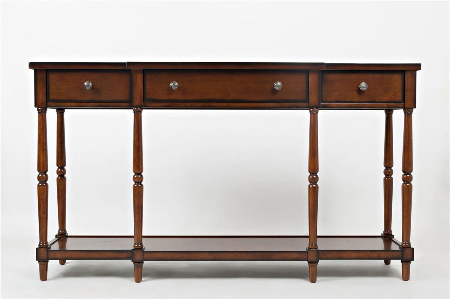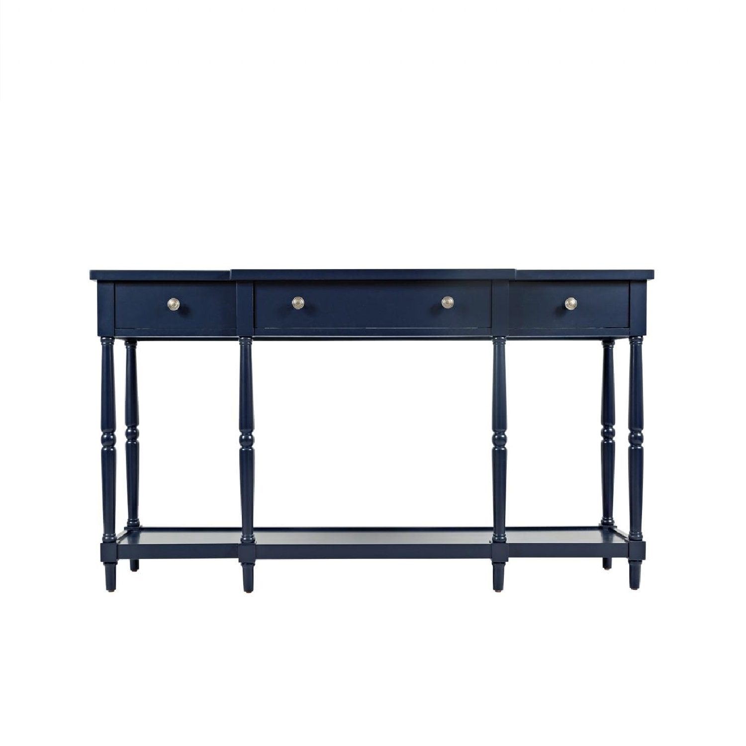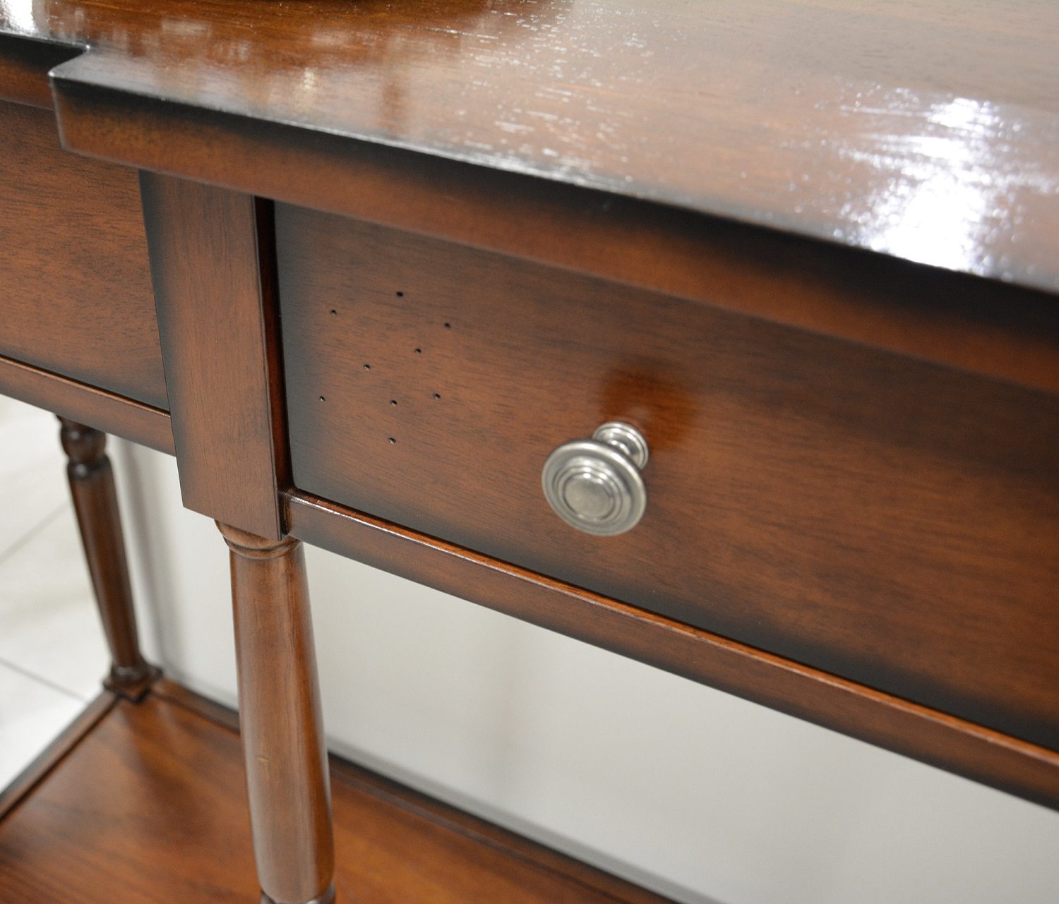 Elegantne Hampton-stiilis konsoollaud, mida iseloomustavad klassikalised treitud jalad ja ajatu disain. Laud sobib hästi nii esikusse, elutuppa kui ka magamistuppa. Praktilisust lisavad kolm sahtlit lihtsate metallist käepidemetega ning alumine riiul, mis pakub lisaruumi esemete hoiustamiseks. Mööbli eripäraks on dekoratiivne vanutusviimistlus, mis imiteerib puidul looduslikke üraski jälgi.
