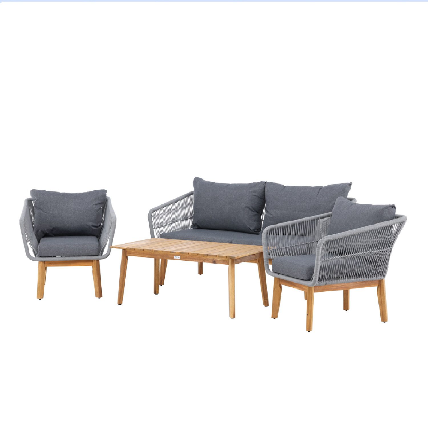 Chania – trendikas diivanikomplekt, mis keskendub mugavusele ja silmapaistvale disainile. Komplekti kuulub kahekohaline diivan, kaks tugitooli ning madal kohvilaud, mis on valmistatud kvaliteetsest akaatsiapuidust. Diivanikomplektil on alumiiniumraam koos akaatsiapuidust jalgadega ning selja- ja külgdetailid on viimistletud köiepunutisega, mis loob elegantse ja kaasaegse ilme. Akaatsia detailid koos klassikalise kohvilaua vormiga annavad komplektile eksklusiivse ja tervikliku välimuse.