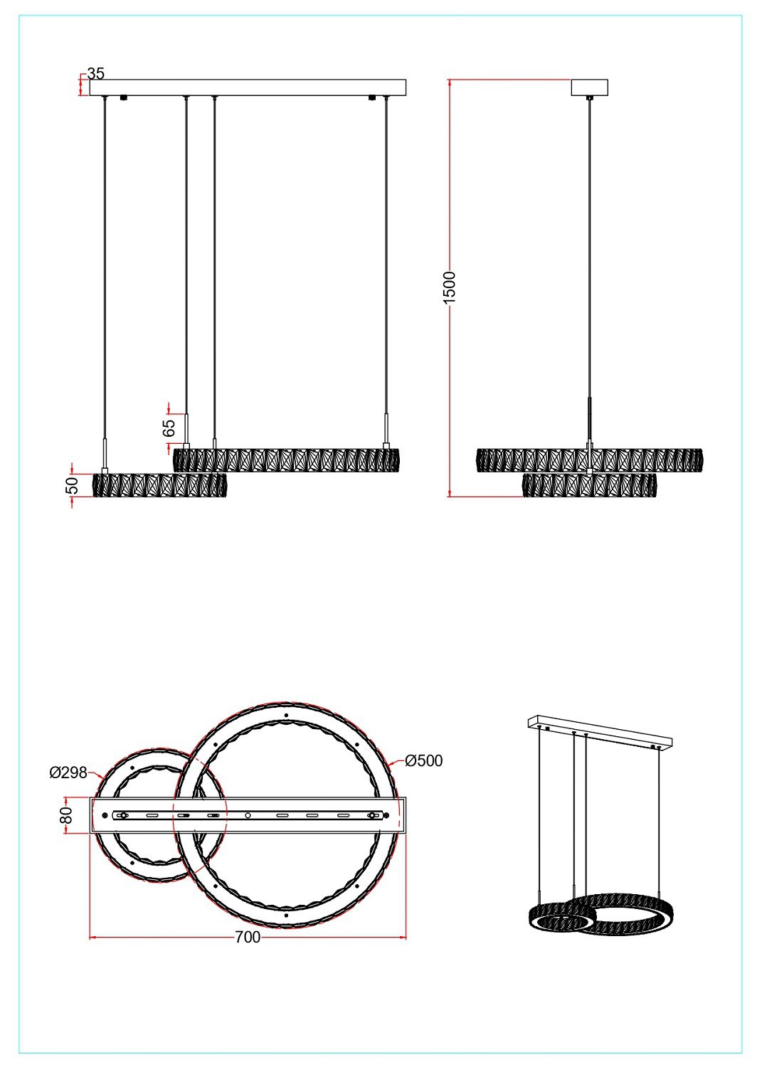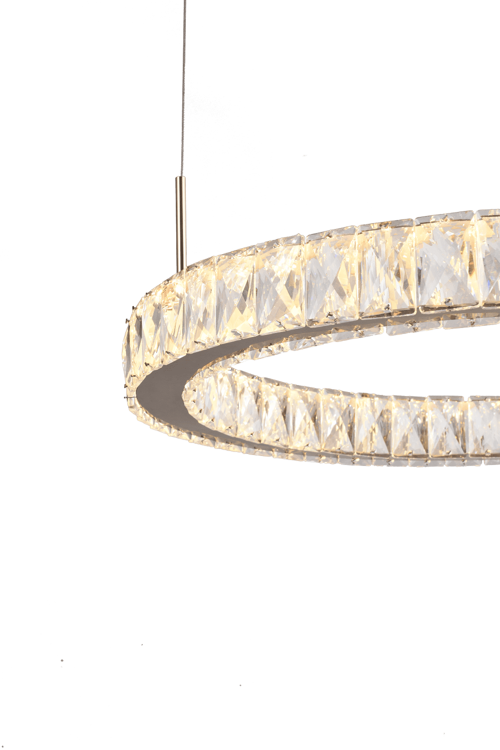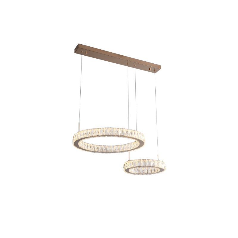 Elegantne kaasaegne Girona ripplamp, mis koosneb kahest erineva suurusega ringikujulisest valguselemendist. Iga ring on kaunistatud kaunistatud kristallidega, mis hajutab valgust ja loob luksusliku sära. Õhuke metallraam ja peened terastrossid annavad konstruktsioonile kerguse, nii et lamp näib õhus hõljuvat. Selline disain ühendab minimalistliku vormi ja glamuurse detaili, sobides ideaalselt söögilaua kohale, elutuppa või esinduslikku ruumi. Lamp toimib nii tõhusa valgusallika kui ka dekoratiivse sisustuselemendina, mis lisab ruumile modernset elegantsi.