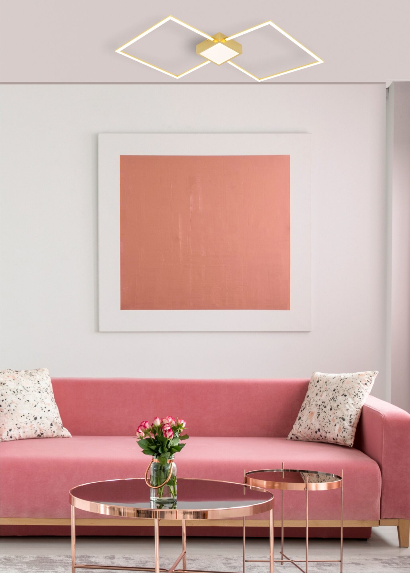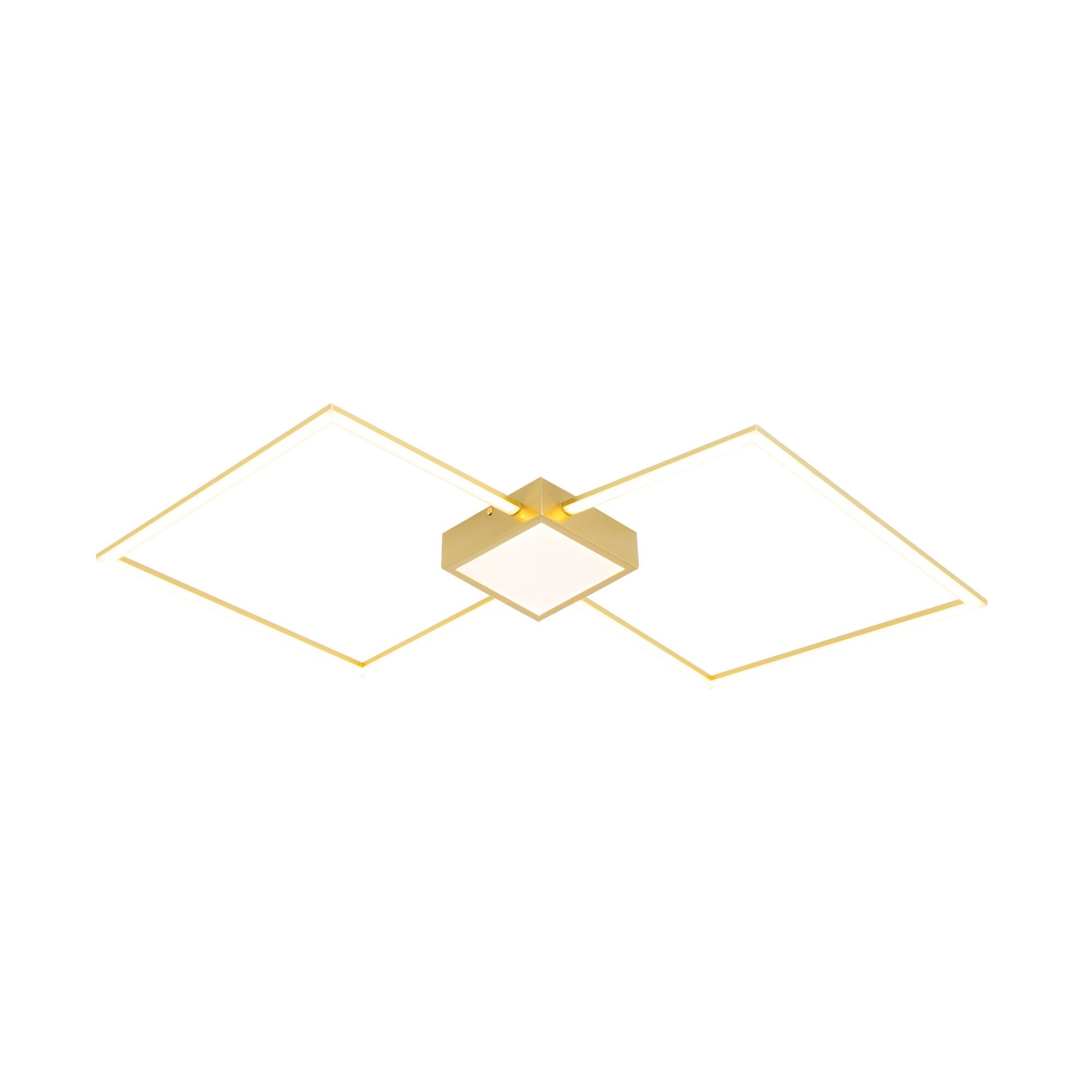 Kaasaegne Hex laelamp minimalistliku ja geomeetrilise disainiga. Lamp koosneb kahest kuldse raamiga rombikujulisest konstruktsioonist, mis on asetatud diagonaalselt ja ristuvad keskosas. Keskel on nelinurkne korpus, millest raamid lähtuvad. Korpuse alumisel poolel on valgust hajutav valge pind. Sobib hästi moodsasse või modernsesse interjööri, kus väärtustatakse puhtaid jooni ja geomeetrilisi vorme.