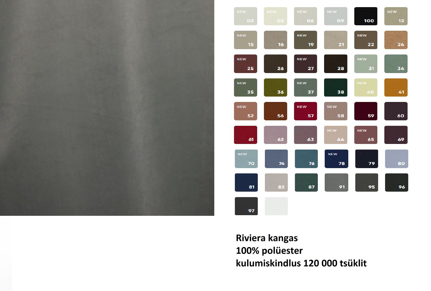 Malmo ja Riviera on vastupidavad ning kvaliteetsed mööblikangad, mis sobivad hästi igapäevaseks kasutamiseks nii kodustes kui ka suurema koormusega interjöörides. Malmo kangas on meeldiva tekstuuriga ja annab mööblile kaasaegse ning hubase välimuse. See on valmistatud 100% polüestrist ning selle kulumiskindlus Martindale’i testis on 25 000–30 000 tsüklit. Lisaks on Malmo kangal väga hea topilisekindlus (5), mis aitab säilitada kanga kauni välimuse ka intensiivse kasutuse korral. Riviera kangas on samuti 100% polüestrist ning paistab silma eriti kõrge vastupidavusega – Martindale’i test ulatub koguni 120 000 tsüklini. Tänu sellele sobib see suurepäraselt diivanitele, istmetele ja ka kommertspindadele, kus mööbel on aktiivses kasutuses. Materjal on hoolduskindel, kergesti puhastatav ja värvikindel. Galeriist leiate Riviera kangaste kogu toonivaliku ning soovi korral on võimalik tellida mööblit ka teistes kangastes – selleks palume saata vastava päringu.
