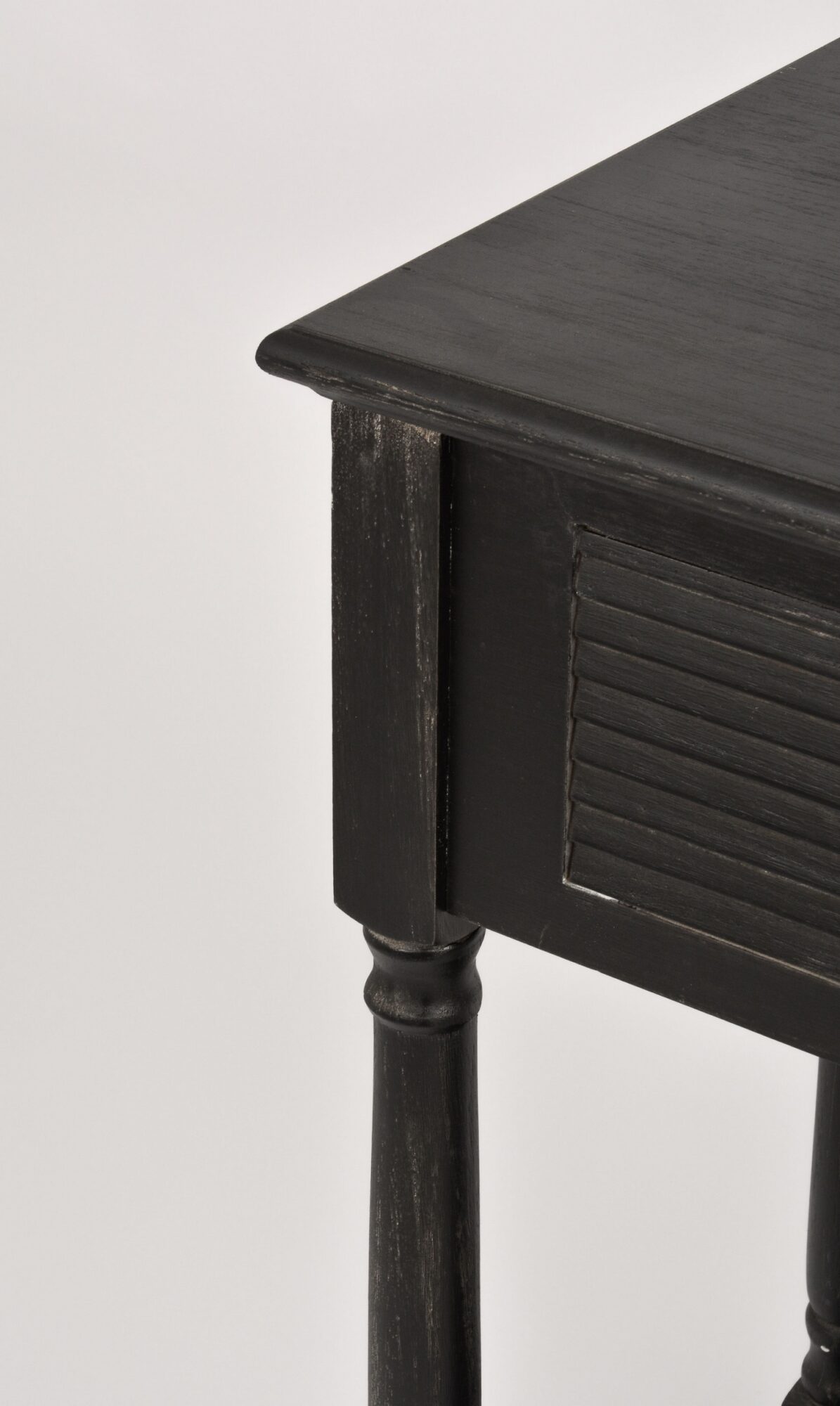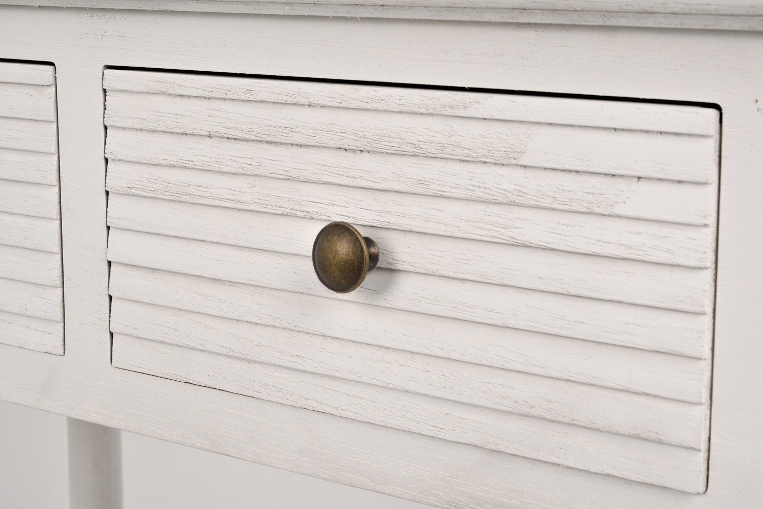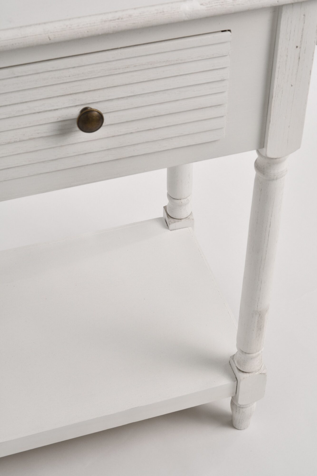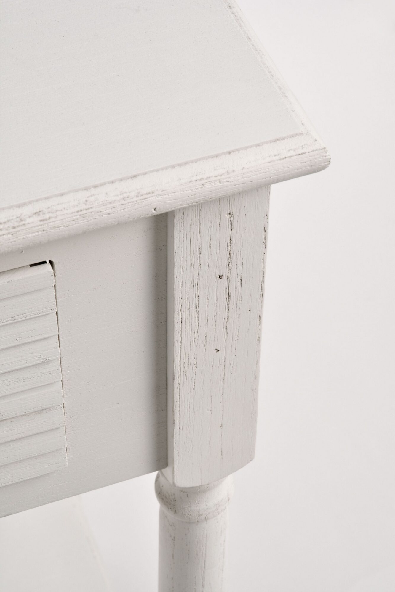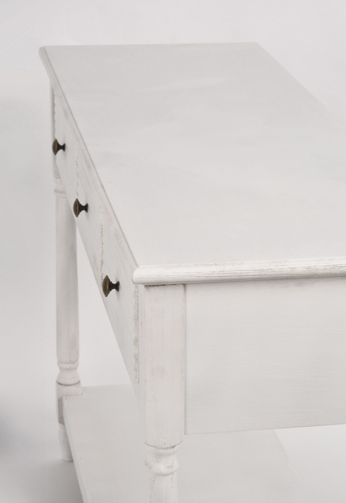 Käsitsi maalitud konsoollaud on Provence’i ja Boho stiilis. Laud on valmistatud paulownia puidust ja MDF-ist ning on varustatud dekoratiivsete messingutooni metallist käepidemetega, freesitud sahtlipaneelide ja keerutatud jalgadega. Ebaühtlane värvipind on kunstlikult kulunud, paljastades puidu struktuuri.