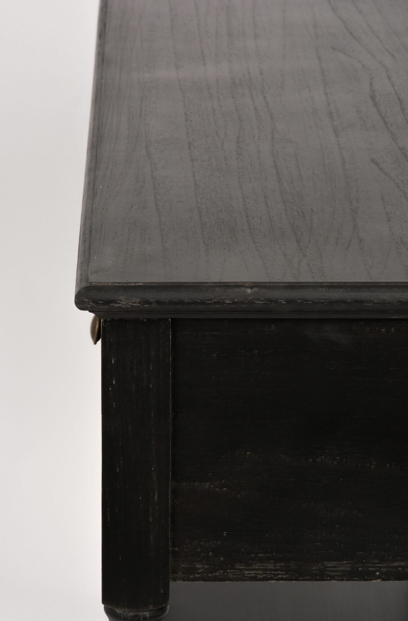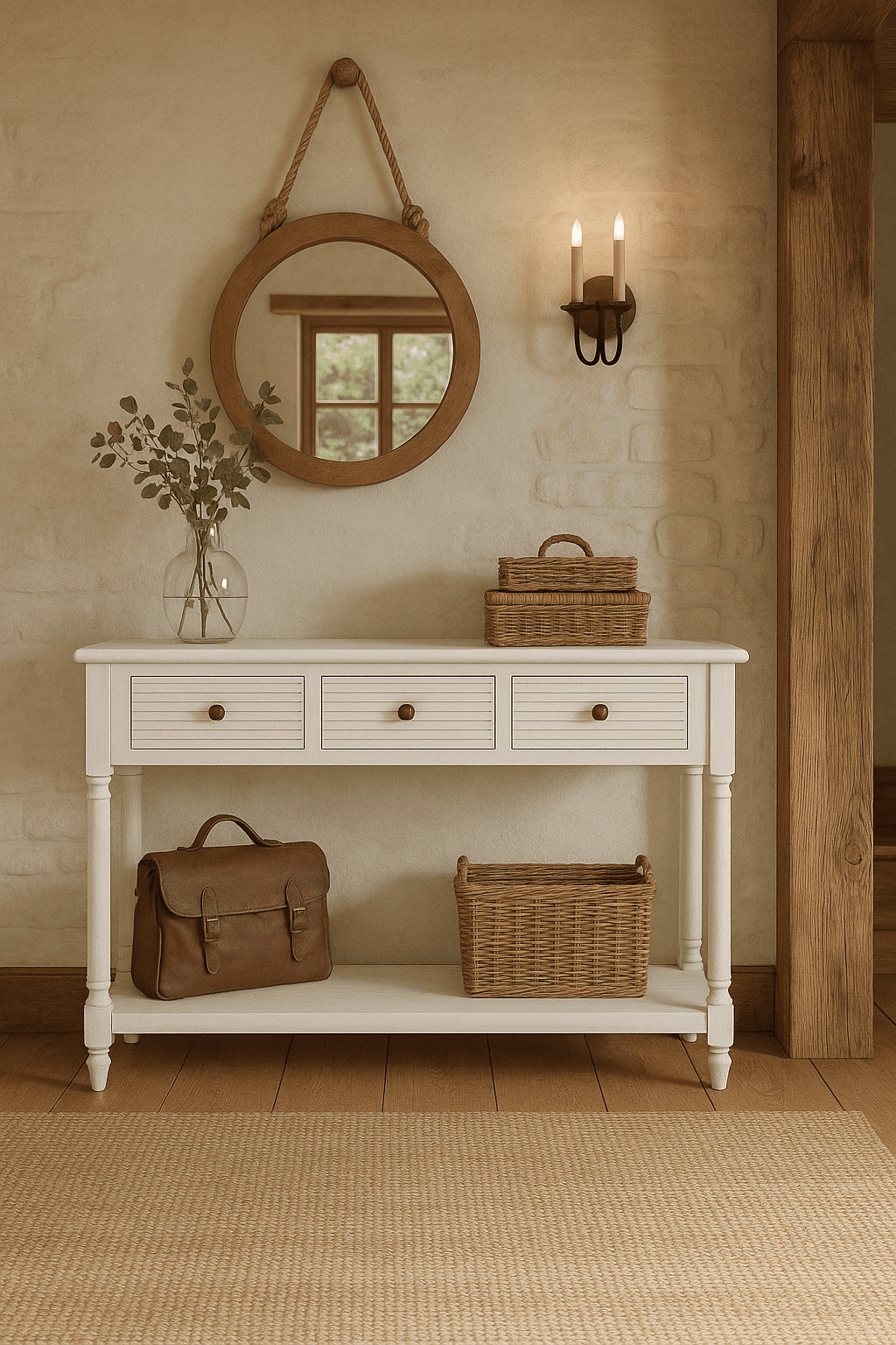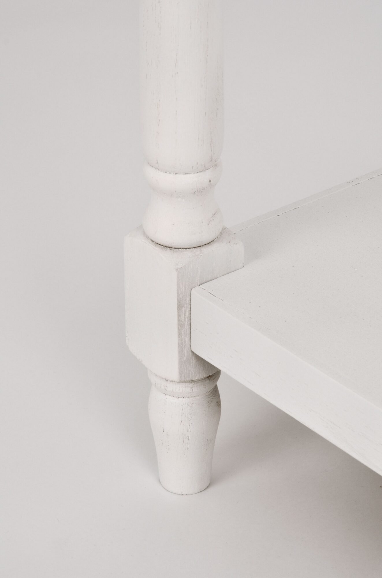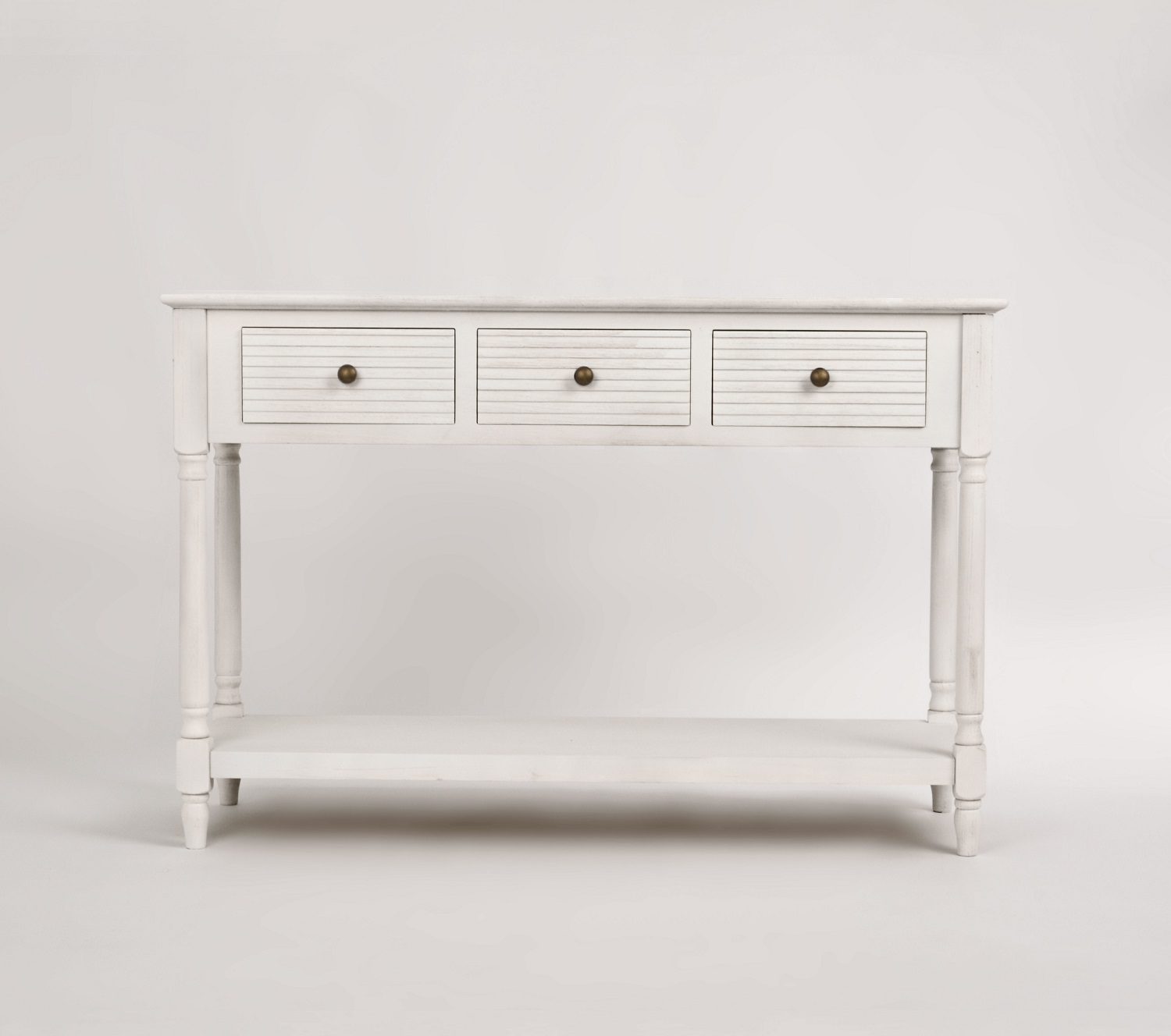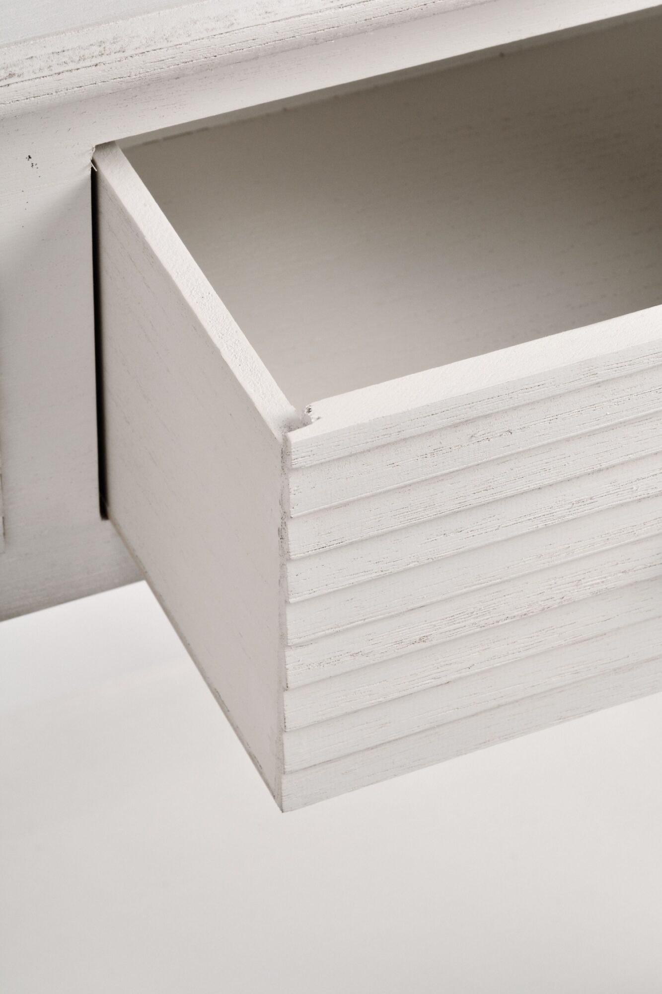 Käsitsi maalitud konsoollaud on Provence’i ja Boho stiilis. Laud on valmistatud paulownia puidust ja MDF-ist ning on varustatud dekoratiivsete messingutooni metallist käepidemetega, freesitud sahtlipaneelide ja keerutatud jalgadega. Ebaühtlane värvipind on kunstlikult kulunud, paljastades puidu struktuuri.