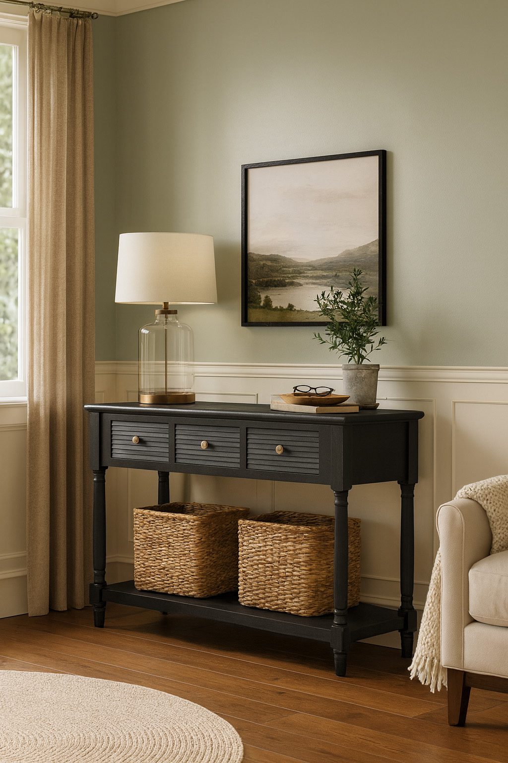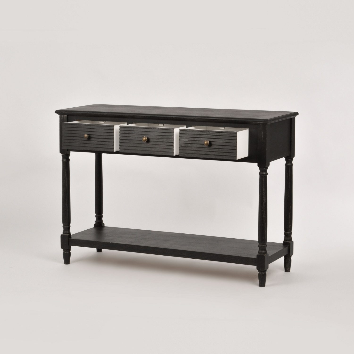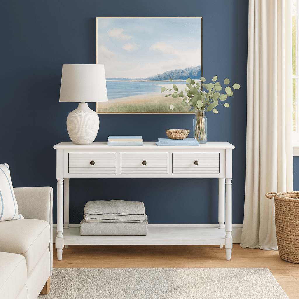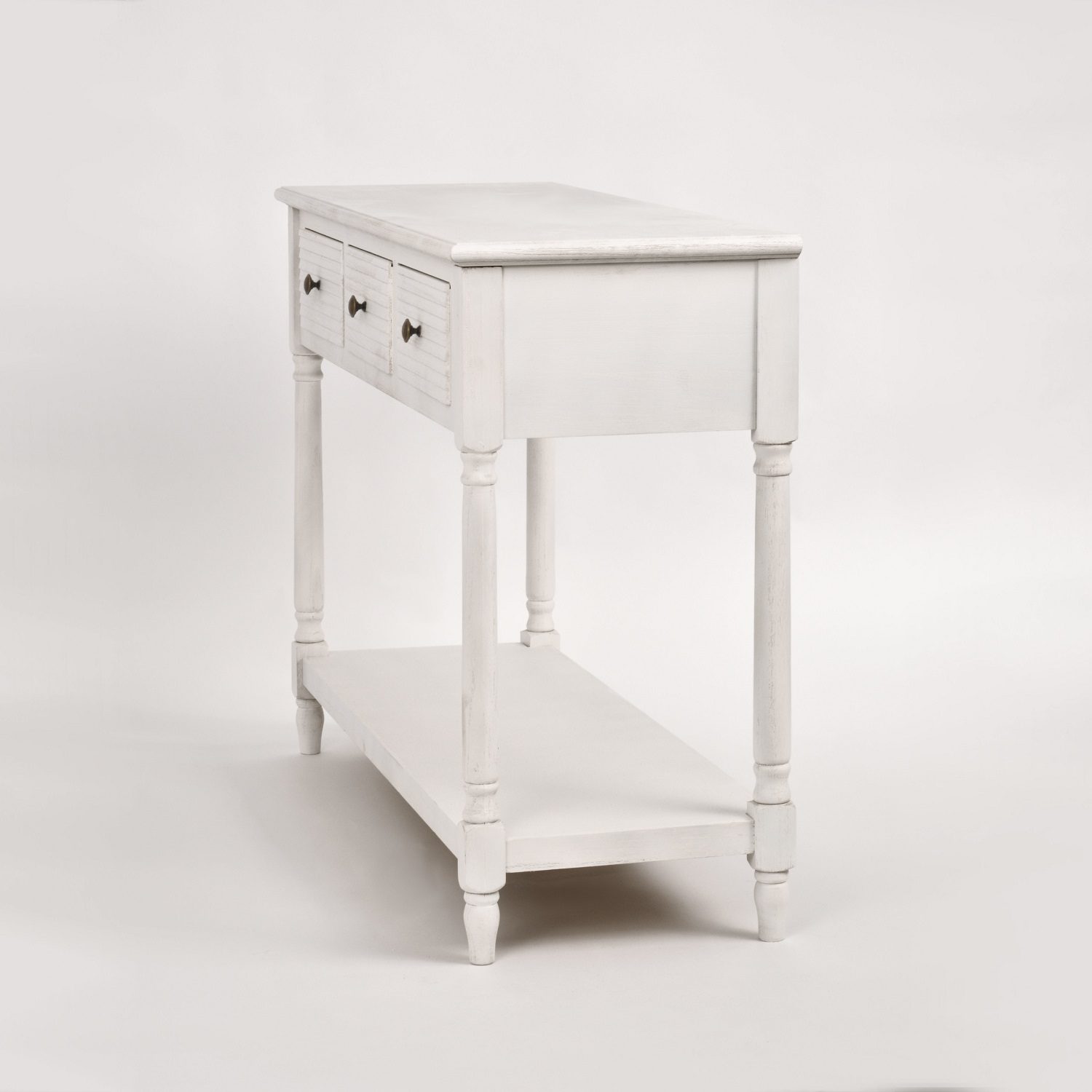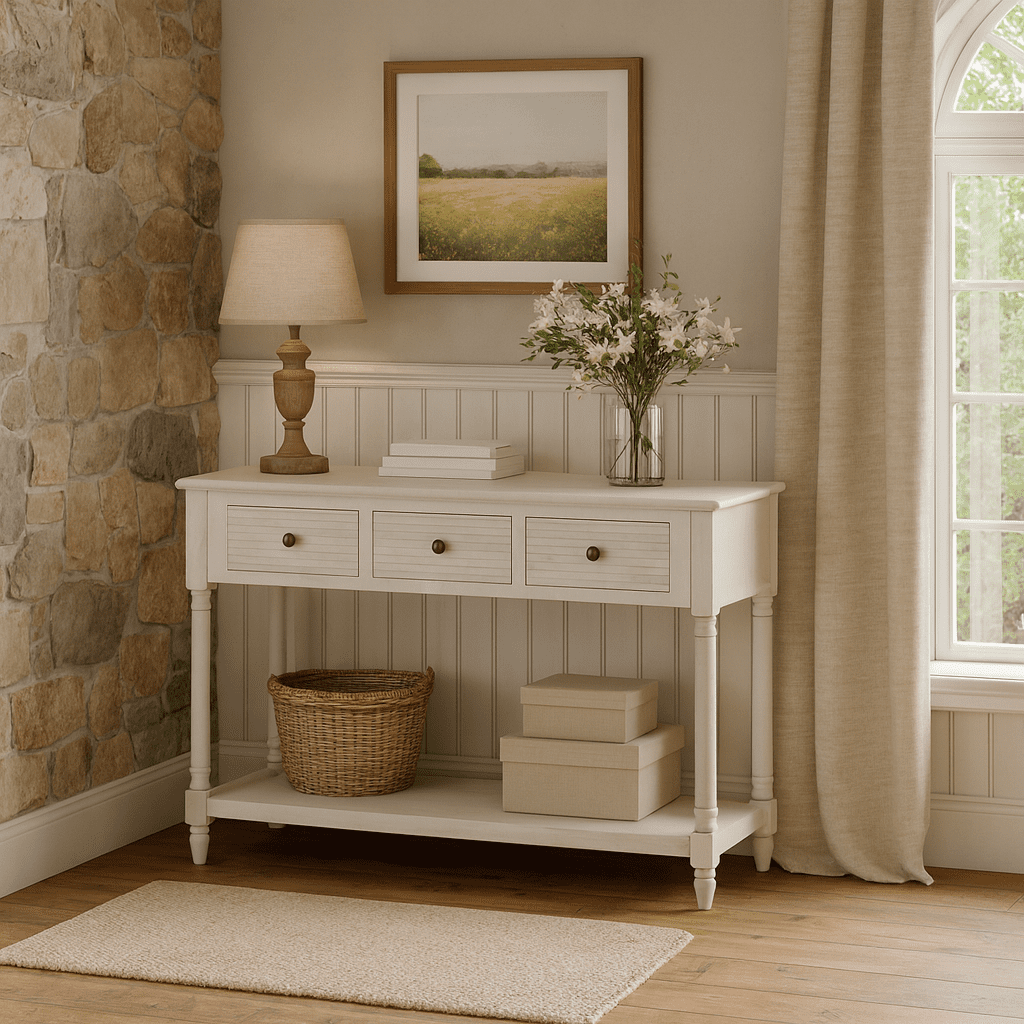 Käsitsi maalitud konsoollaud on Provence’i ja Boho stiilis. Laud on valmistatud paulownia puidust ja MDF-ist ning on varustatud dekoratiivsete messingutooni metallist käepidemetega, freesitud sahtlipaneelide ja keerutatud jalgadega. Ebaühtlane värvipind on kunstlikult kulunud, paljastades puidu struktuuri.