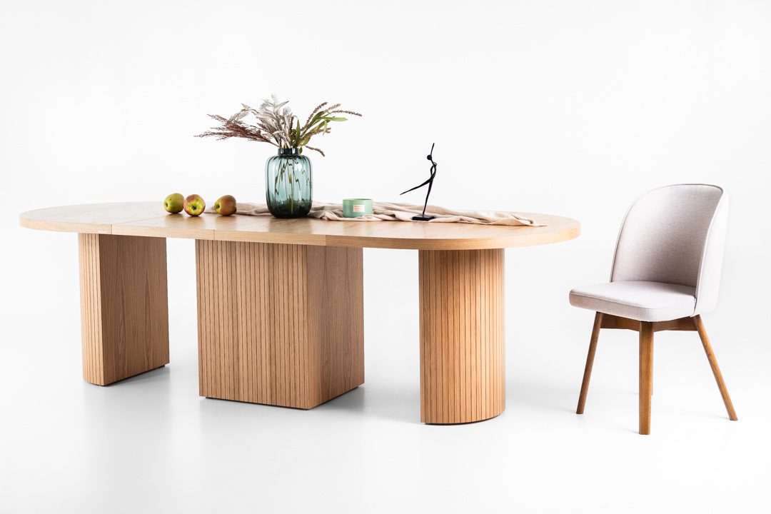 Lusso Oval söögilaud on ainulaadne kombinatsioon elegantsist, funktsionaalsusest ja modernsest disainist. Selle 4 cm paksune ovaalne lauaplaat on valmistatud spoonist ning toob esile puidu loomuliku süümustri, lisades interjööri soojust ja ajatut iseloomu. Ovaalne keskne jalg, mida kaunistab elegantne ribistus, tagab konstruktsiooni stabiilsuse ning toimib tugeva disainiaktsendina. Tänu sellele sobib laud suurepäraselt nii modernsesse kui ka klassikalisse sisekujundusse, rõhutades ruumi iseloomu ja stiili.