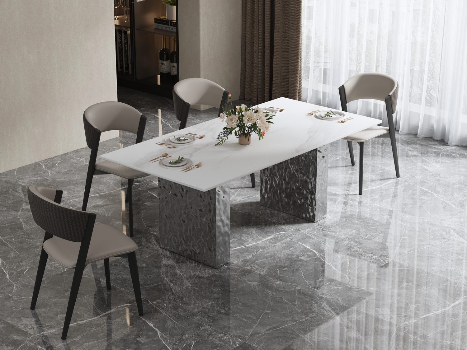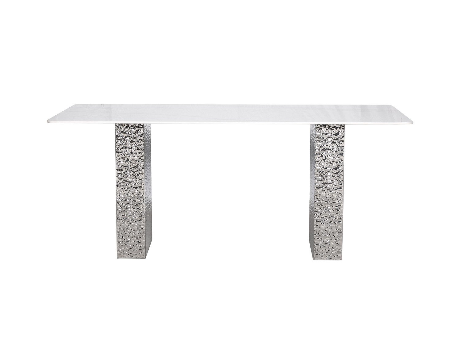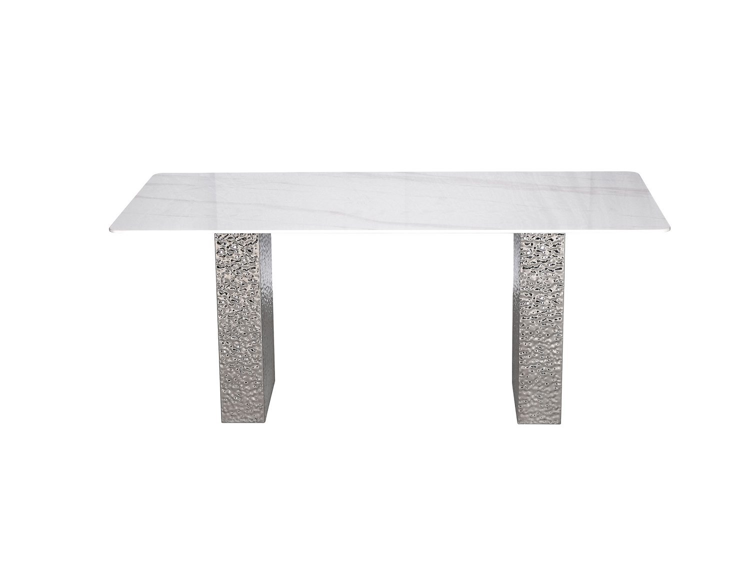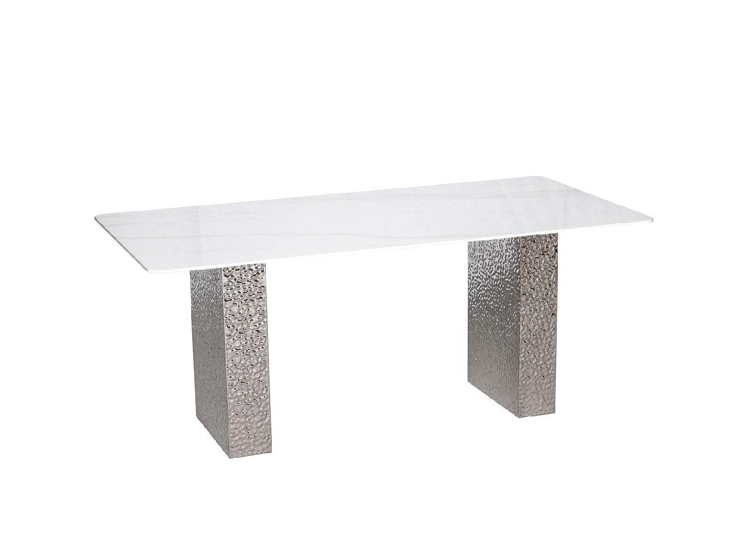 Stiilne laud hõbedase roostevabast terasest alusega, mis annab interjöörile modernse ja elegantse ilme. Ristkülikukujuline valge lauaplaat on marmorit imiteeriva mustriga, lisades ruumile ajatut luksust. Jalad on dekoratiivselt vasardatud pinnaga ning kroomitud viimistlusega, mis loob efektse valgusmängu ja toob disaini esile. Läikiv lauapind täiendab tervikut ning rõhutab selle esinduslikku iseloomu.