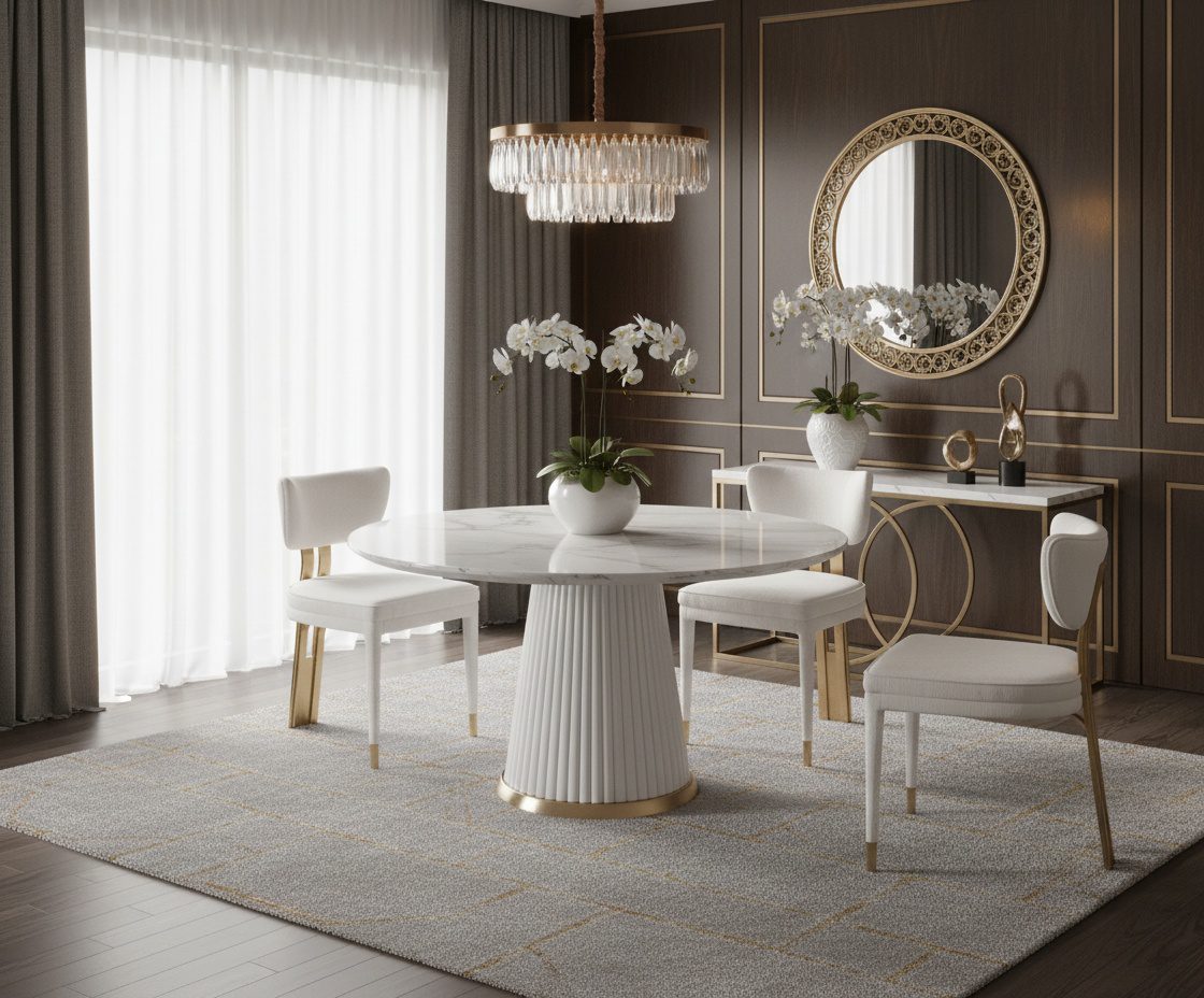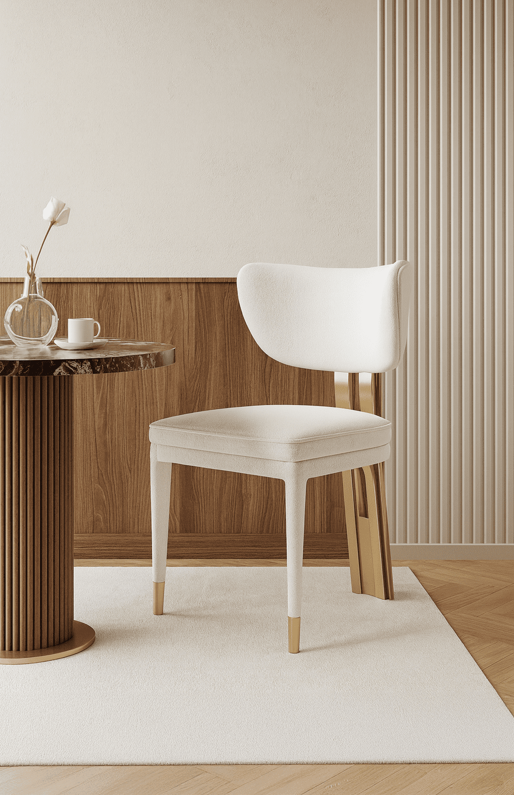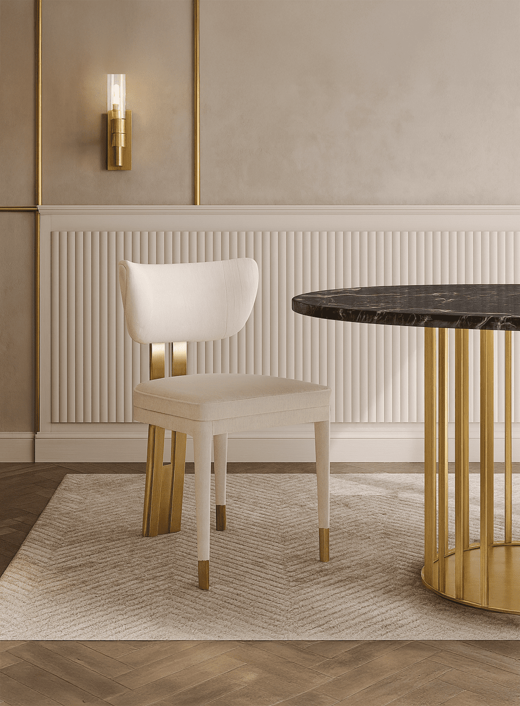 Kaunis polsterdatud tool Modig sarjast avaldab muljet oma kuldse, harjatud roostevabast terasest jalgadega, mis on ühendatud pehme valge šenillkangaga. Tool lisab igale söögitoale elegantse ilme.