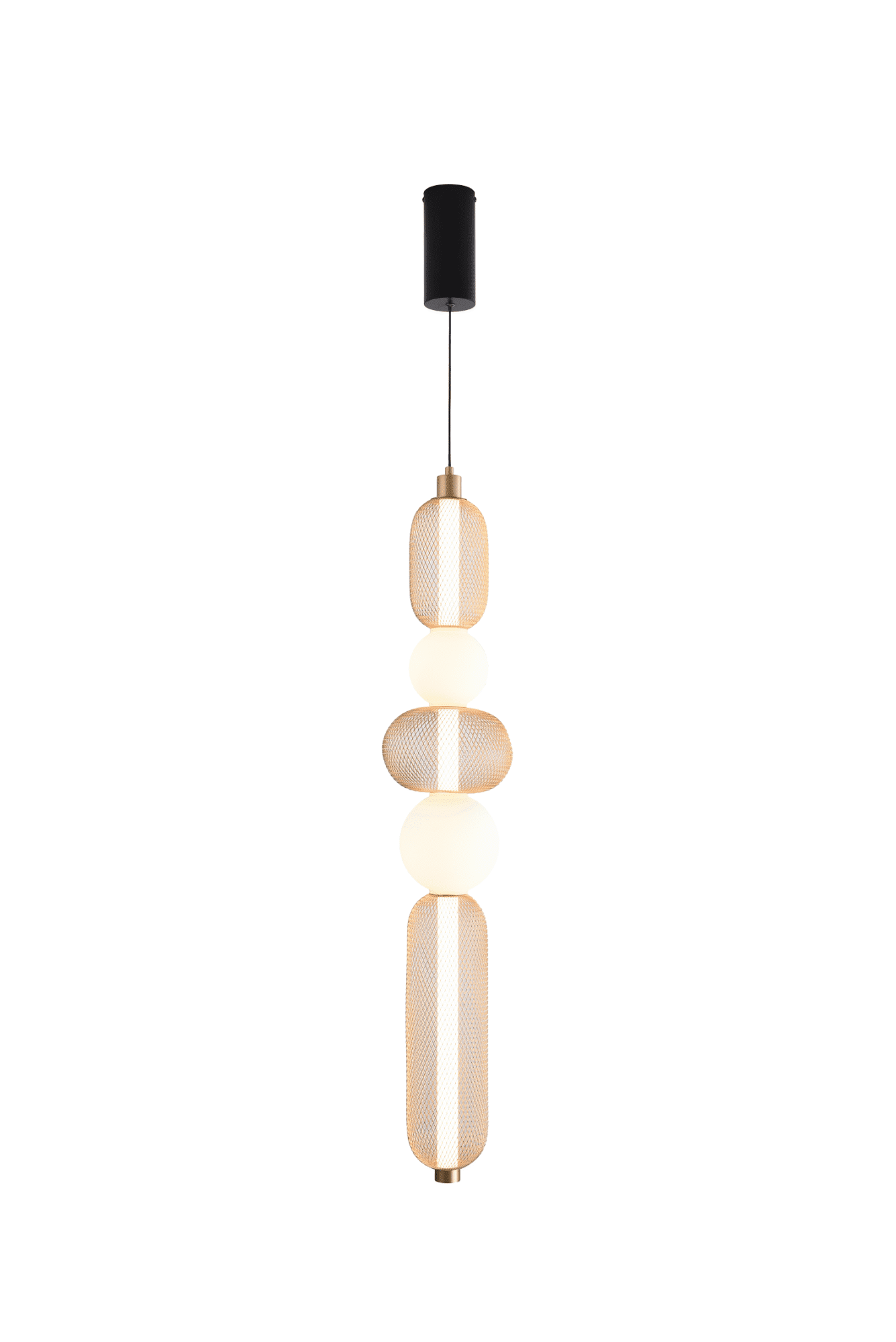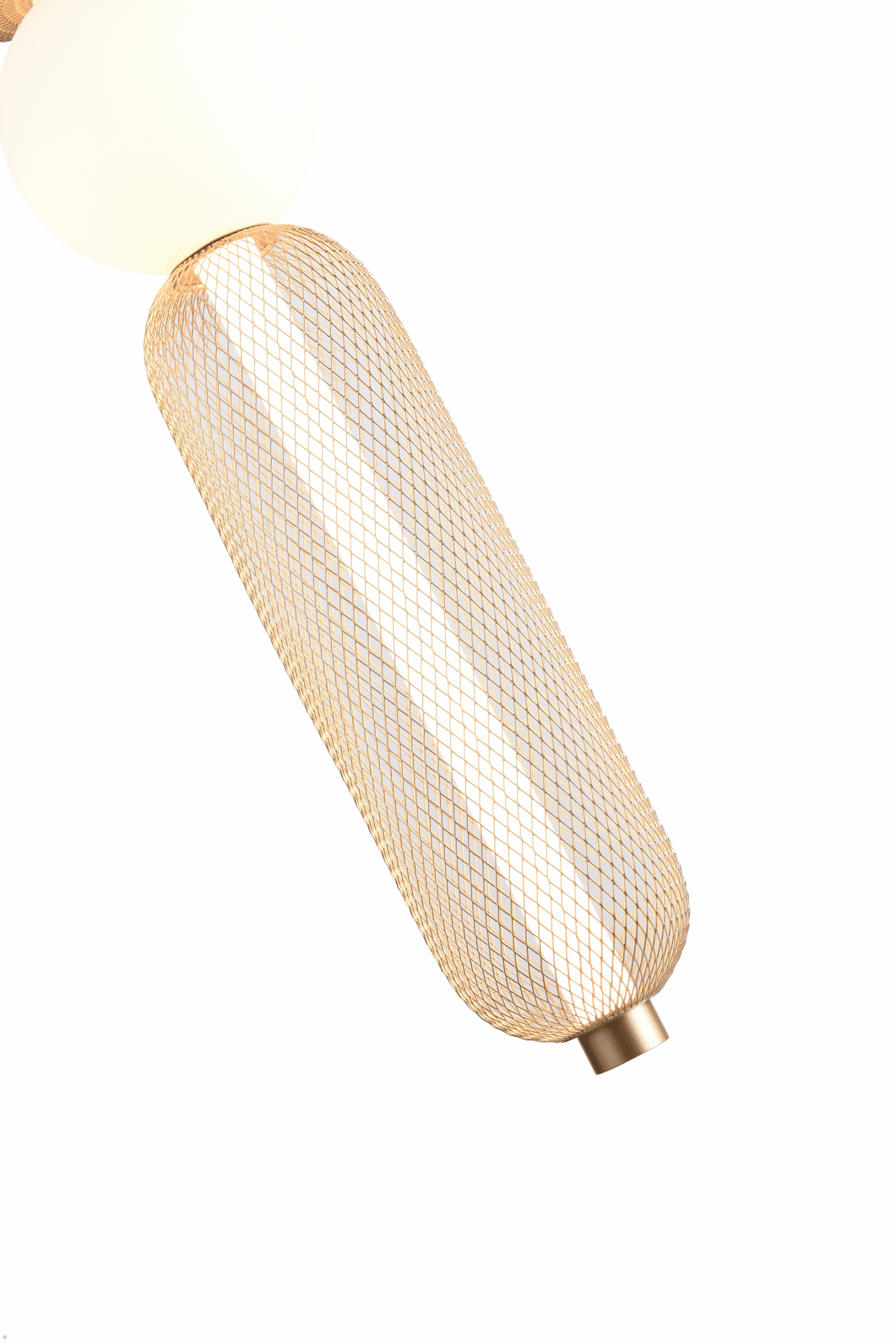 Rippvalgusti Sarr – silmapaistev näide kaasaegsest disainvalgustusest. Konstruktsioon ühendab mati, piimvalge värvitooniga sfäärid ja piklikud silindrid kuldse metallraamiga. See kooslus annab lampile harmoonia ja dünaamika, ühendades elegantsi ning kerge industriaalaktsendi. Õhukeste terastrosside abil riputatud lamp näib justkui õhus hõljuvat, luues ruumi kerguse ja peenuse mulje. Geomeetria ja materjalide kontrast võimaldavad mudelit sobitada nii modernsesse minimalistlikku interjööri kui ka loft- või glamuurse stiiliga ruumi.