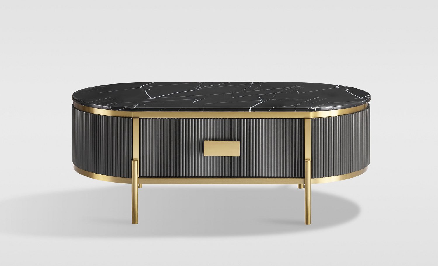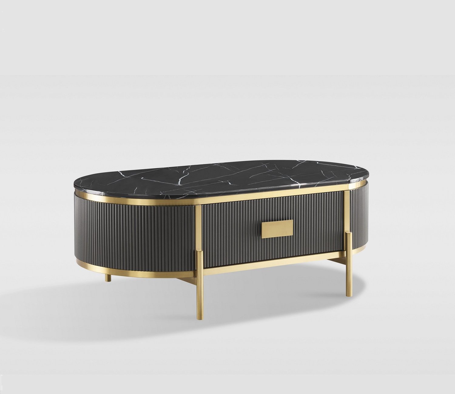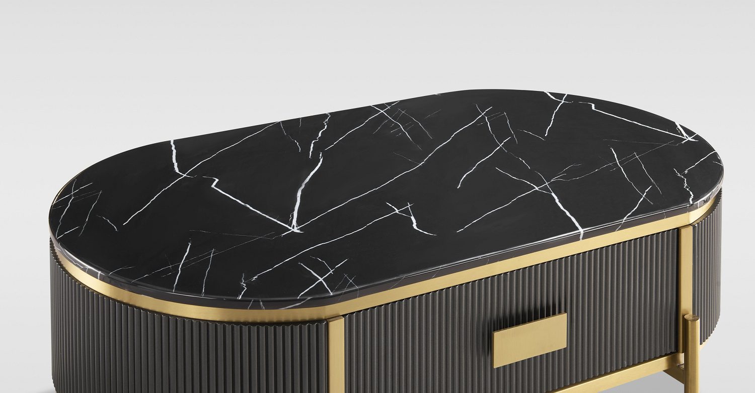 Stiilne ja elegantne grafiidivärvi kohvilaud kuldsete detailide ja jalgadega, mis lisab igasse interjööri luksuslikku aktsenti. Laua raam on viimistletud peene soonelise puidumustriga, mis loob sügavuse ja tekstuuri. Pealispinda katab läikiv, marmorilaadse viimistlusega sünteetiline marmortasapind, mis ühendab endas nii vastupidavuse kui ka modernse välimuse. Laual on üks sahtel, mis liigub sujuvalt metallist soft-close siinidel, tagades vaikse ja pehme sulgumise. Metallist käepidemed täiendavad üldist luksuslikku disaini.