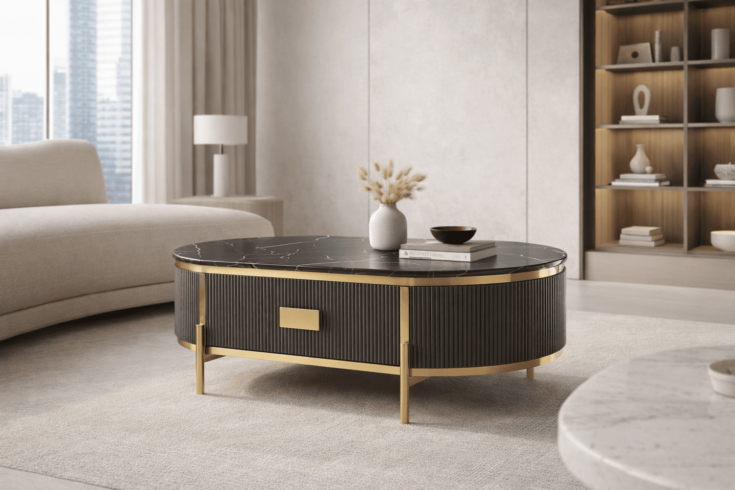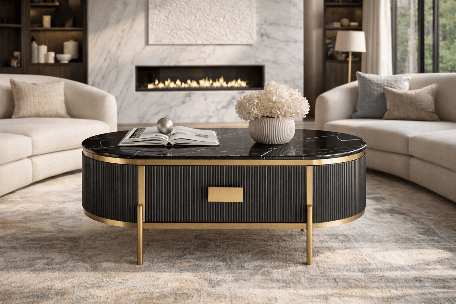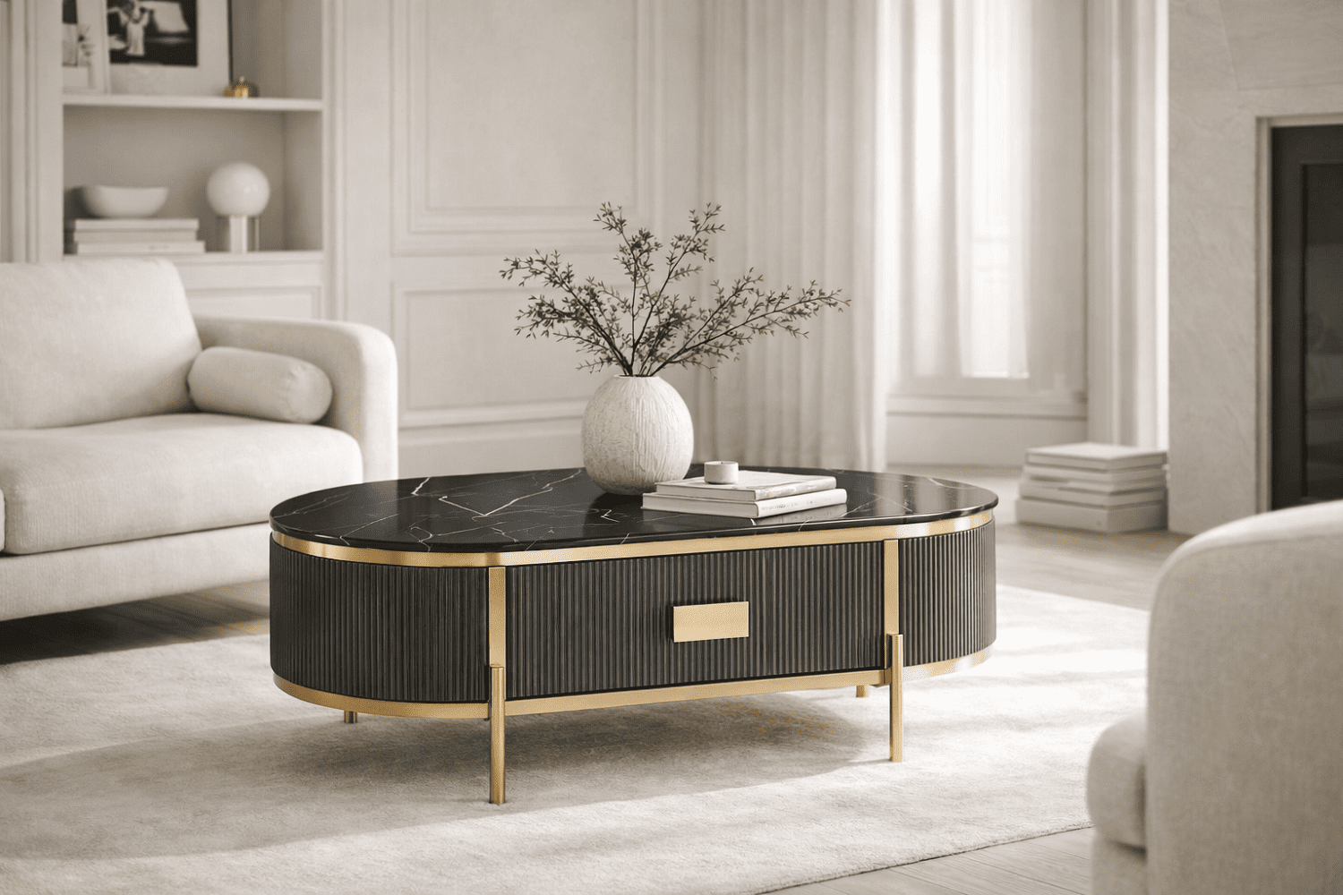 Stiilne ja elegantne grafiidivärvi kohvilaud kuldsete detailide ja jalgadega, mis lisab igasse interjööri luksuslikku aktsenti. Laua raam on viimistletud peene soonelise puidumustriga, mis loob sügavuse ja tekstuuri. Pealispinda katab läikiv, marmorilaadse viimistlusega sünteetiline marmortasapind, mis ühendab endas nii vastupidavuse kui ka modernse välimuse. Laual on üks sahtel, mis liigub sujuvalt metallist soft-close siinidel, tagades vaikse ja pehme sulgumise. Metallist käepidemed täiendavad üldist luksuslikku disaini.