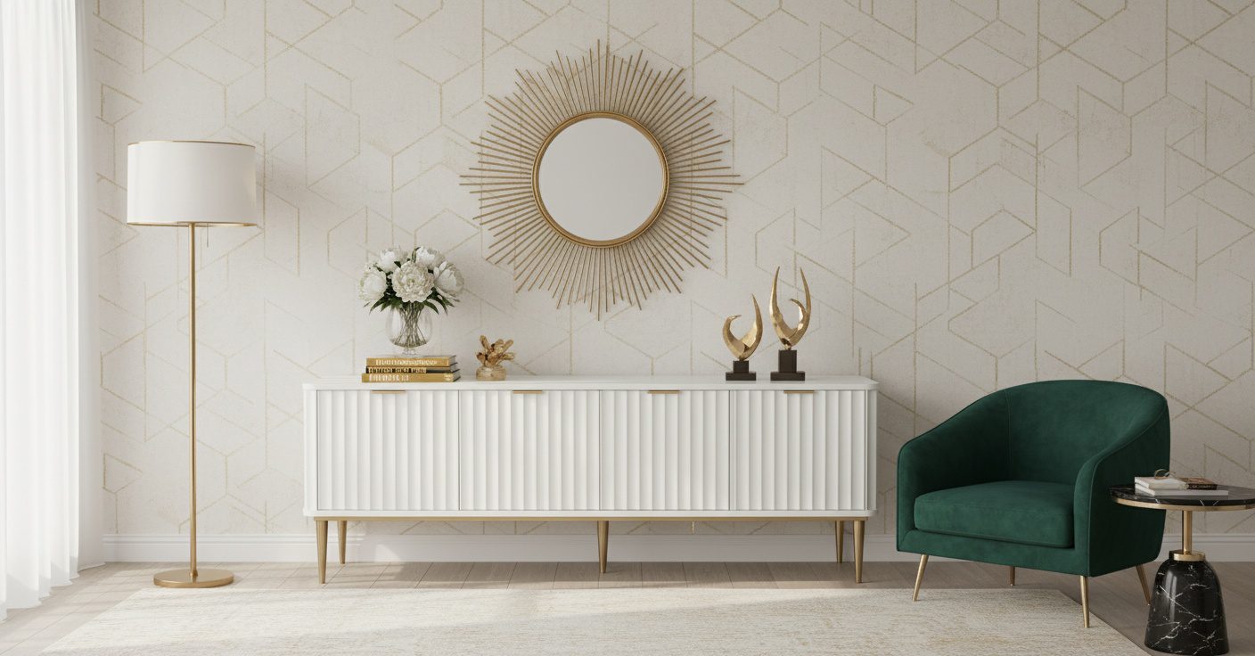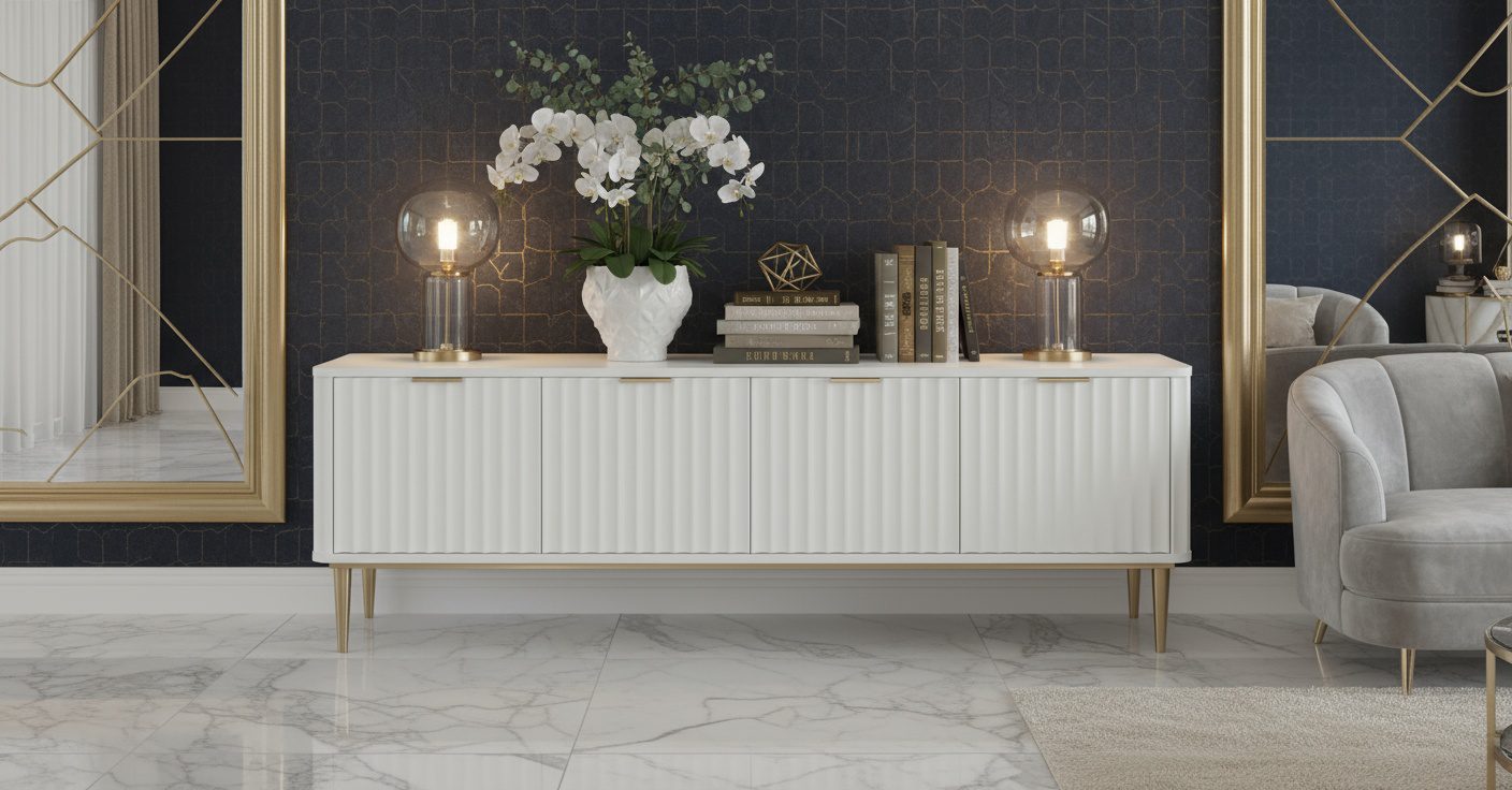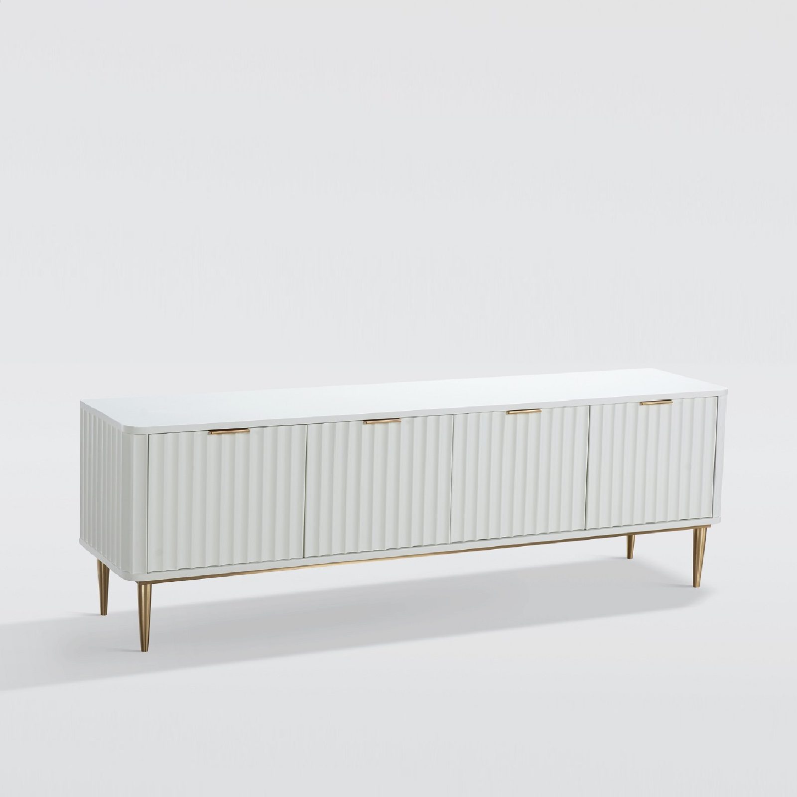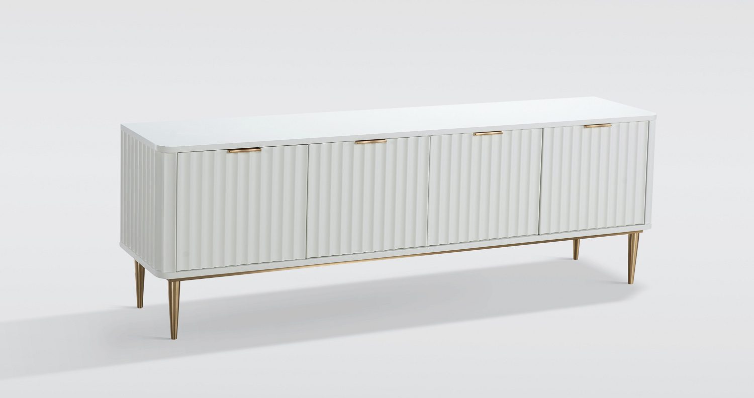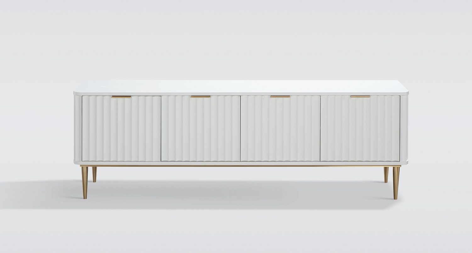 Stiilne ecru-valge TV-alus kuldsete käepidemete ja jalgadega. Kere ja esipaneelid on kaunistatud soonelise puidumustriga ning ümarate külgede servadega.