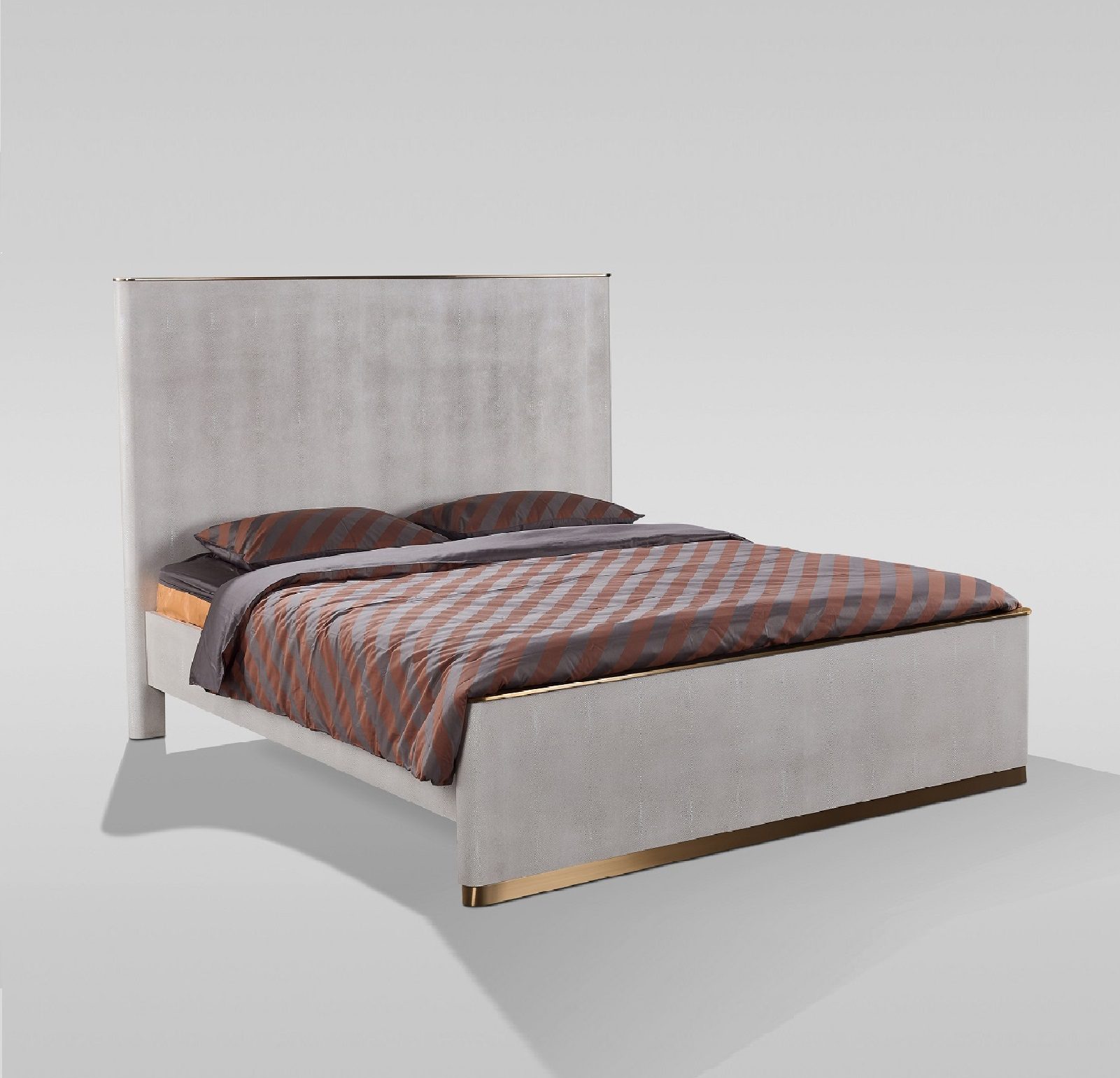 Elegantne beežikas-hall voodi. Selle lihtsat vormi rõhutavad kuldse tooniga roostevabast terasest jalused ja ääred. Voodi on kaetud hainahka imiteeriva kunstnahaga (faux shagreen), mis annab ainulaadse tekstuuri ja omapärase välimuse. Voodi saadaval mitmes suuruses: 166 x 210 x 138 (160 x 200) cm/ 186 x 210 x 138180 x 200) cm. Voodi saab suurepäraselt sobitada sama sarja ST891 öökapiga. Ostes tooted komplektina, saad soodsama hinna – vaata lähemalt siit.