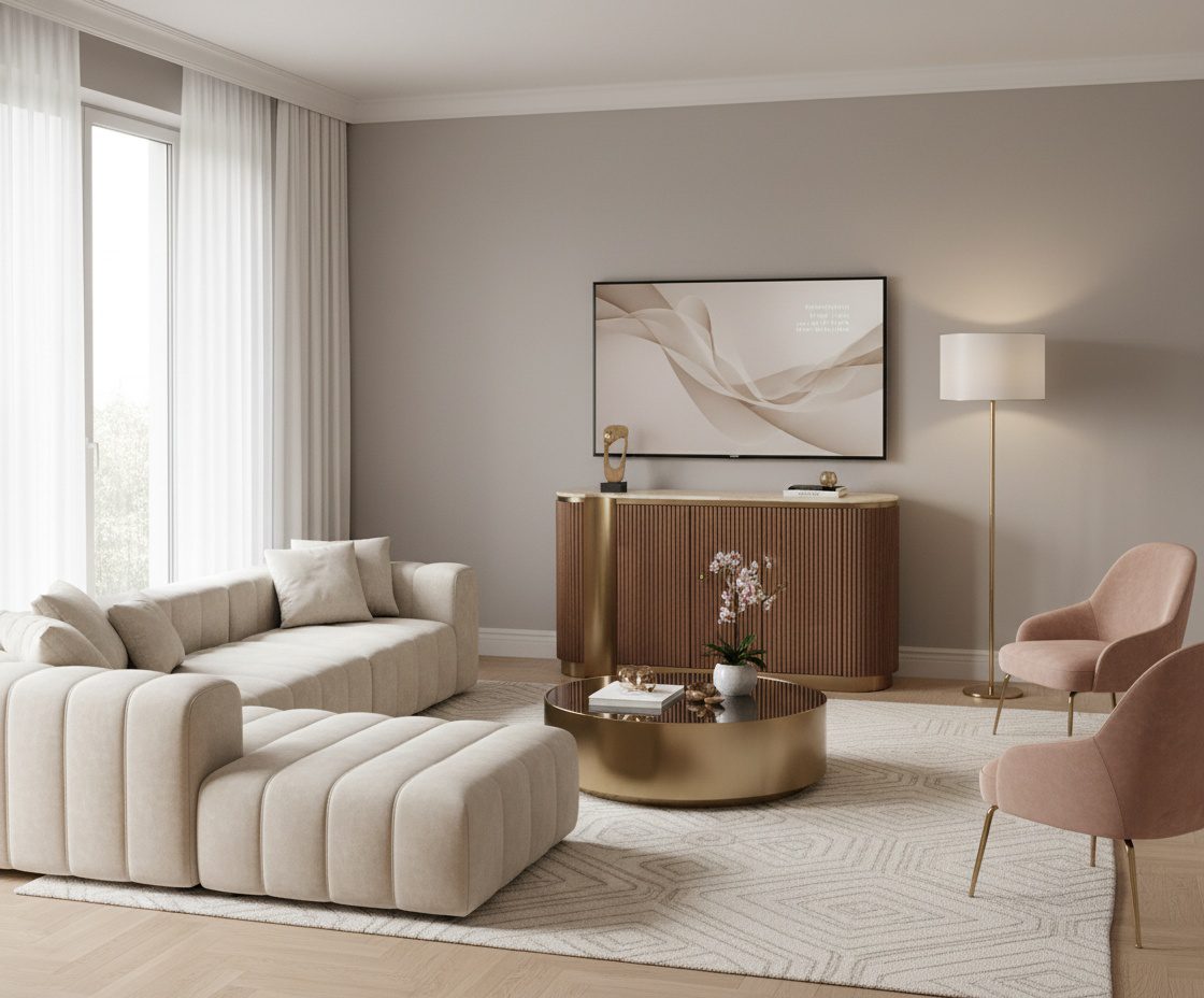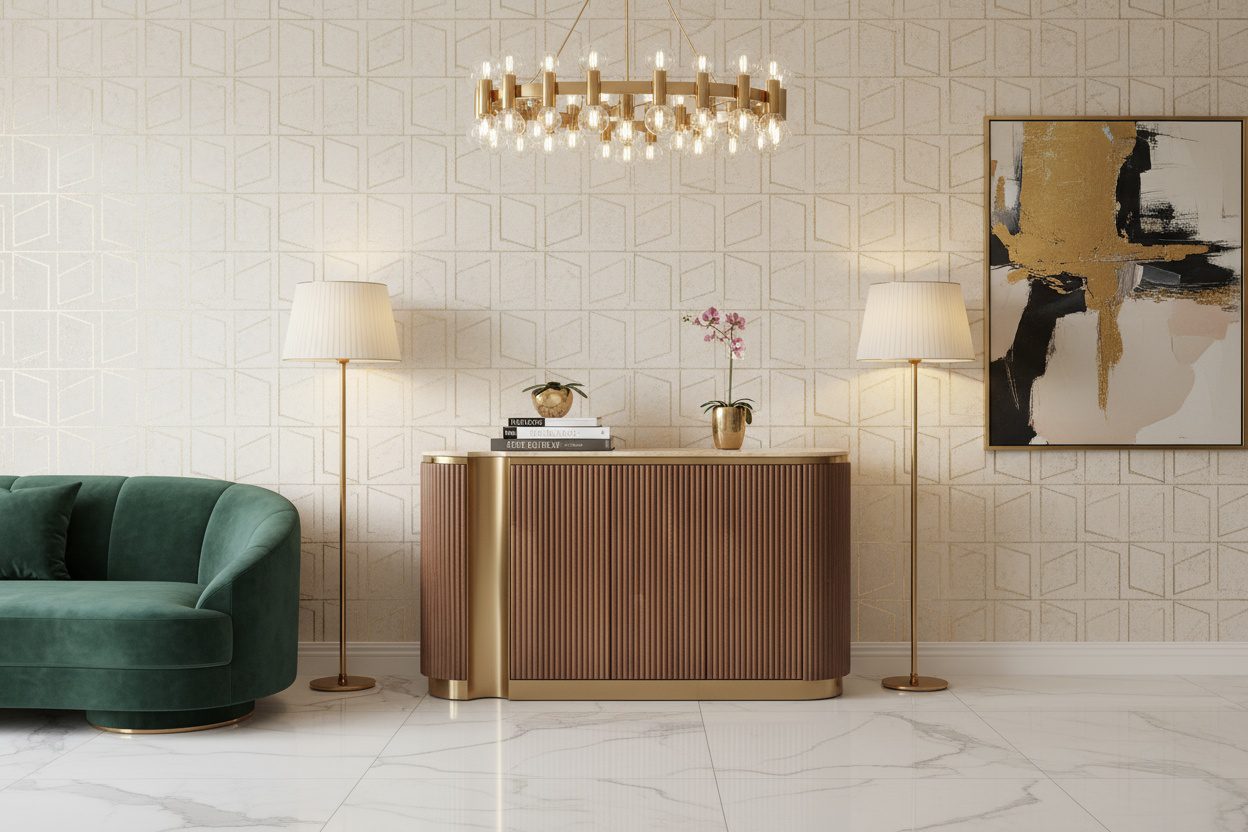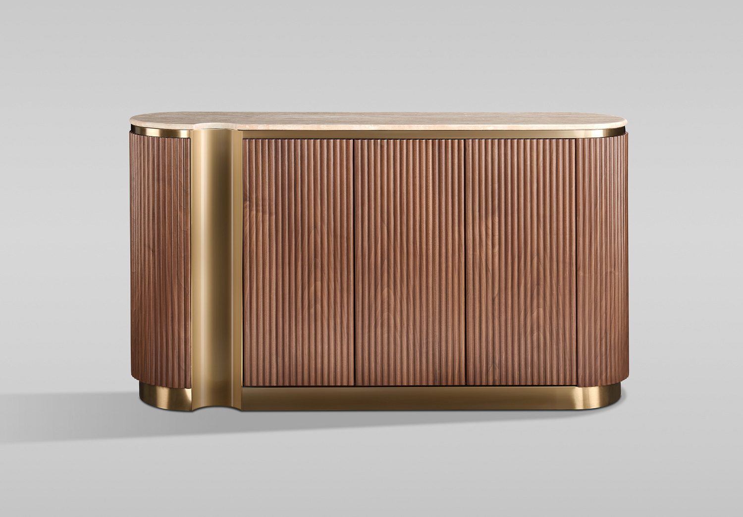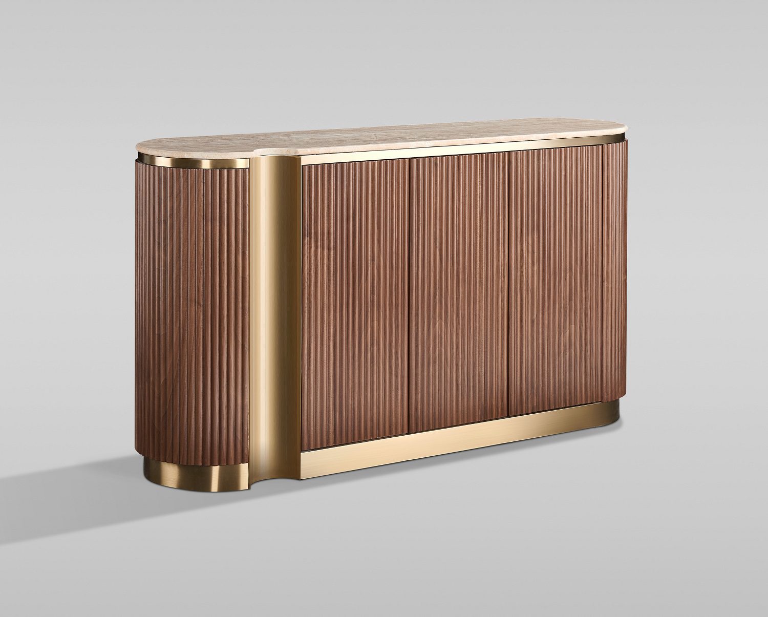 Stiilne kummut pähklipuumustriga, mida ilmestavad kuldsed detailid ja kuldne alusraam. Karkassi kaunistab sooneline puidumuster ning pealispinnaks on naturaalne travertiin.