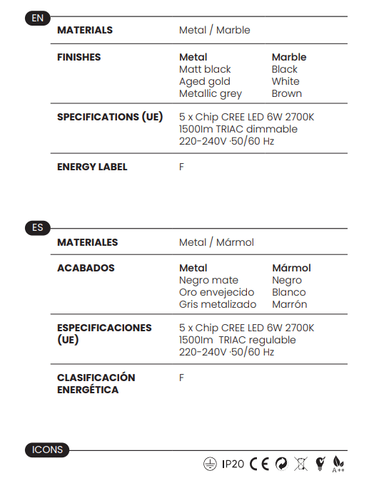 Metall: vanutatud kuld+valge marmor / matt must+must marmor / metallhall+pruun marmor